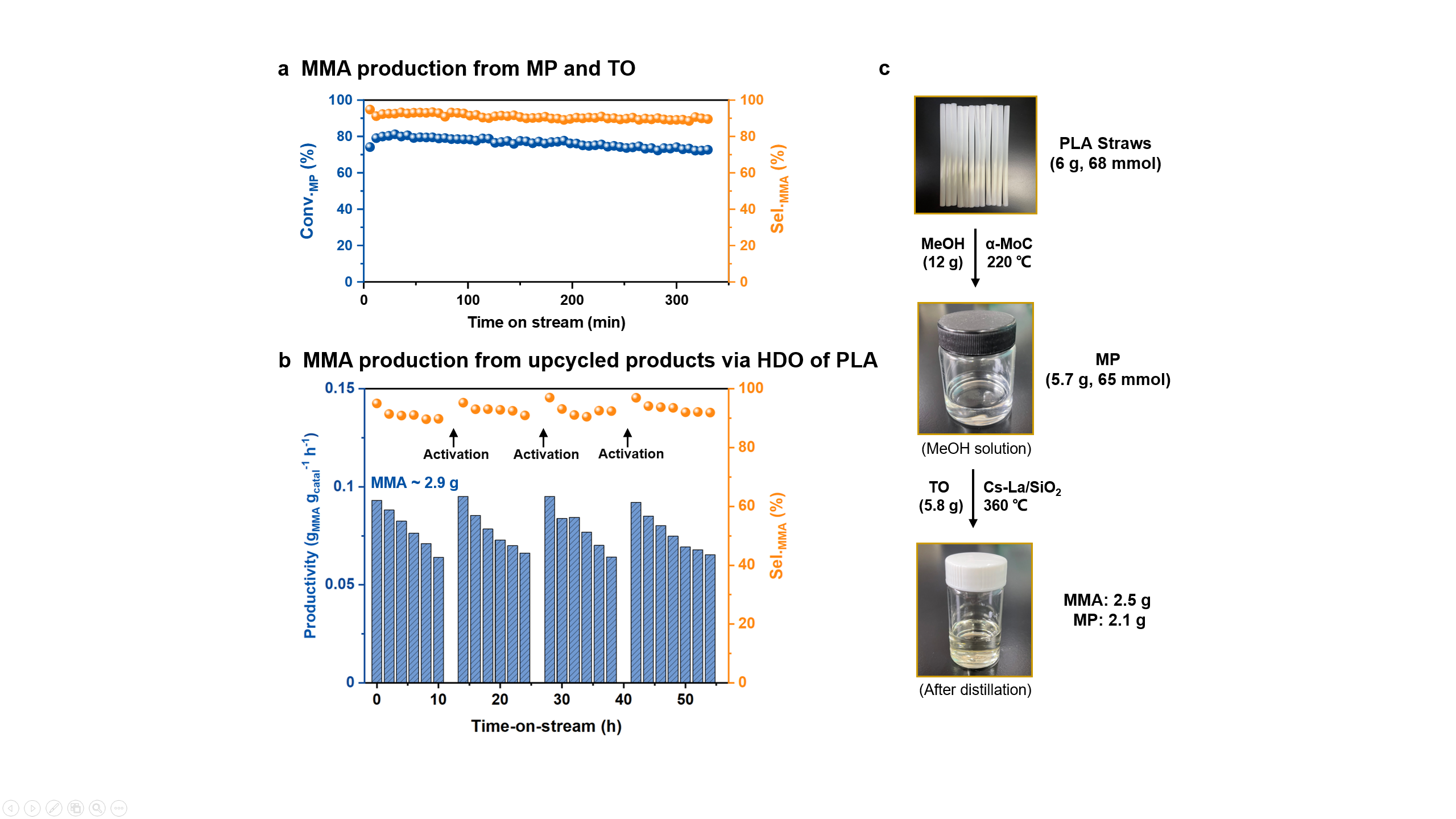 近日,北京大学马丁/王蒙课题组首次报道了一种通过两步催化反应将聚乳酸塑料转化为甲基丙烯酸甲酯的新过程(图1)。在第一步反应中采用α-MoC催化剂及甲醇,在无外加氢气的条件下(反应温度为220度),通过醇解和加氢脱氧过程实现聚乳酸废塑料高效制备丙酸甲酯(聚乳酸转化率> 99%,丙酸甲酯收率~98%)。这种加氢脱氧催化体系同时适用于聚乙醇酸(PGA)及聚己内酯(PCL)的催化降解。进一步采用Cs-La/SiO2催化剂,可以实现丙酸甲酯和甲醛向甲基丙烯酸甲酯的高效转化(图2a,反应温度为380度,丙酸甲酯转化率> 80%,甲基丙烯酸甲酯选择性> 90%)。使用商业聚乳酸吸管(约含83% PLA)评估了聚乳酸两步法转化为甲基丙烯酸甲酯的效率,6 g 聚乳酸吸管经过两步催化转化可获得2.5 g甲基丙烯酸甲酯和2.1 g丙酸甲酯(图2c),值得注意的是,整个反应过程中无需外加氢气。