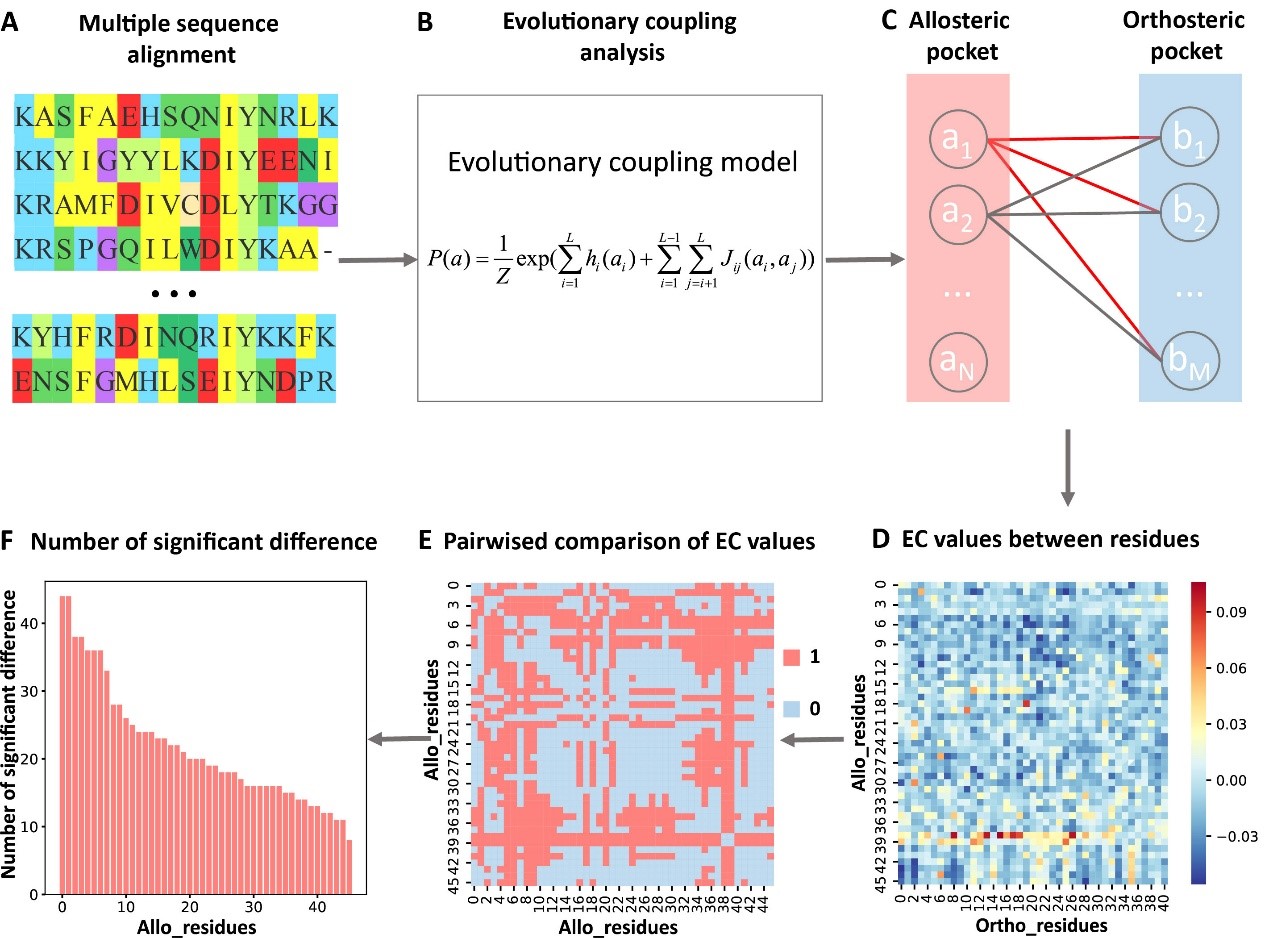 北京大学化学与分子工程学院/前沿交叉学科研究院定量生物学中心来鲁华课题组、北京大学前沿交叉学科研究院定量生物学中心/数学科学学院邓明华课题组和安徽农业大学理学院祝小雷课题组合作应用进化耦合模型对残基之间的共进化进行分析,发现蛋白质的正构位点和别构位点之间存在进化耦合,蛋白质序列上的弱共进化耦合项包含蛋白质功能信息。在此基础上发展了首个预测关键别构残基的计算方法KeyAlloSite,为别构药物的设计和优化、功能蛋白质设计等研究提供了有用的工具。相关研究近日发表在eLife上(eLife 12 (2023), https://elifesciences.org/articles/81850)。