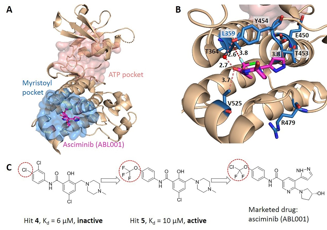 进一步通过两两比较别构口袋中的残基对应的进化耦合值之间的差异,推出别构口袋中的每个残基对应的显著性差异数,将残基对应的显著性差异数归一化为Z-score进行关键别构残基预测(图1)。KeyAlloSite预测的关键别构残基与多个蛋白质体系中的实验结果相一致。例如,在酪氨酸蛋白激酶ABL1(BCR-ABL1)中,KeyAlloSite预测的关键别构残基L359在别构信号传导中起着关键作用。当别构分子hit 4和L359之间没有相互作用时,hit 4尽管结合较强但是没有活性。别构分子hit 5由于和L359之间存在有利的疏水相互作用,所以尽管和hit 4相比结合亲和力更弱,但却具有酶抑制活性(图2)。