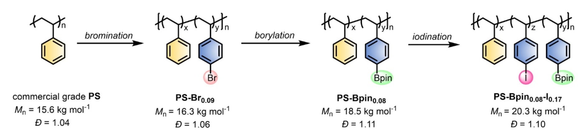 聚苯乙烯是现代塑料工业中最重要的材料之一,被广泛应用于电子产品、食品容器、包装和建筑材料等。聚苯乙烯也非常适合于作为通过官能化获得具有新性能和扩展效用的高价值材料的原料。然而,由于聚苯乙烯中的芳香碳氢键反应性较低,其直接官能化仍然是一个相当大的挑战。过去人们研究的方法包括傅-克烷基化和酰化、卤代甲基化、全氟烷基化、磺化、硝化等。然而,这些方法通常存在诸如反应条件苛刻以及链降解和交联等问题,从而导致官能化效率低且不可控。在聚苯乙烯官能化的各种方法中,芳香族碳氢键的卤化非常有吸引力,因为卤化的产物可以通过碳卤键的后续转获得一系列官能化的聚苯乙烯。虽然人们在聚苯乙烯的卤化方面很早就已开展研究,但是迄今为止发展的卤化绝大部分也会伴随链降解和交联等问题,并且卤化的程度无法精确控制。