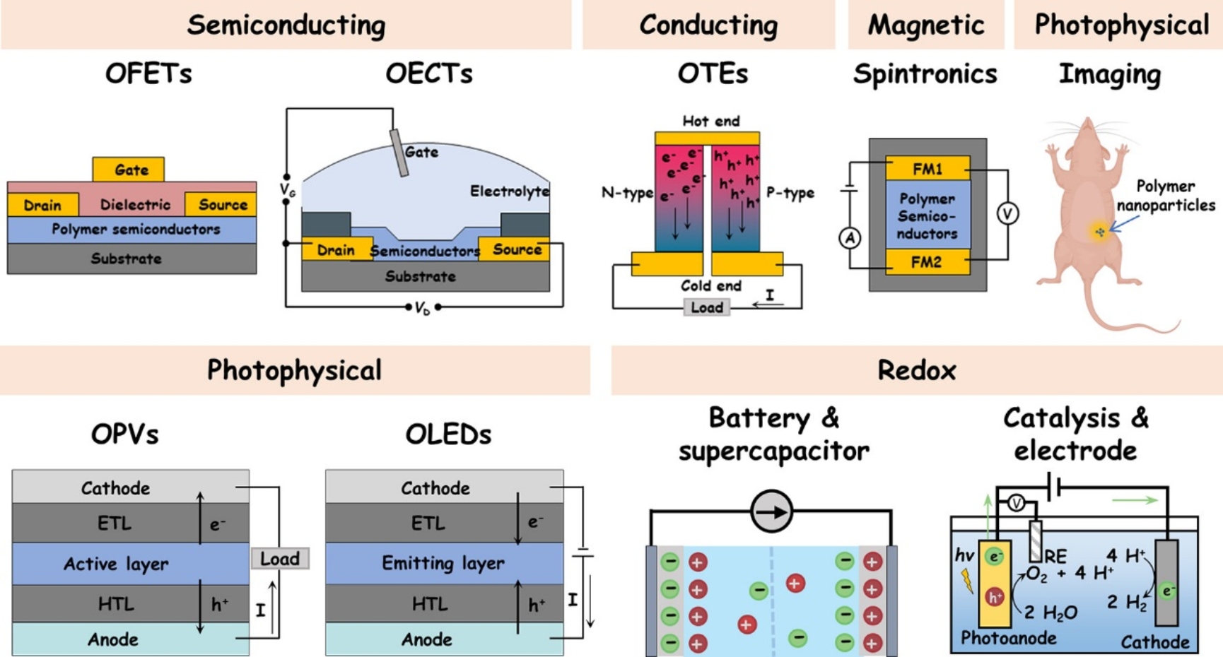 在第三部分,该综述总结了高分子半导体的相关应用。迄今为止,高分子半导体已被广泛用于各种能源储存、转换和催化领域(图5)。主要应用包括:1)利用高分子半导体电荷传输特性的有机场效应晶体管、有机电化学晶体管、有机热电和有机自旋电子器件等;2)利用高分子半导体光物理特性的光学成像、有机太阳能电池和有机发光二极管等;3)利用高分子半导体的氧化还原特性的有机电池、有机超级电容器、高分子催化和光电极等。