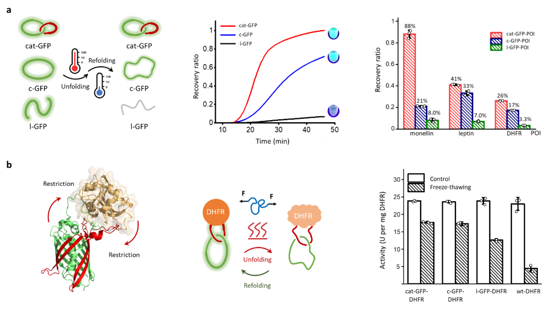 图3. a, 索烃化能够有效提升蛋白质的热回复性。b, 索烃化能够提供额外的构象限制,提升功能蛋白的热回复性、热稳定性以及机械稳定性。