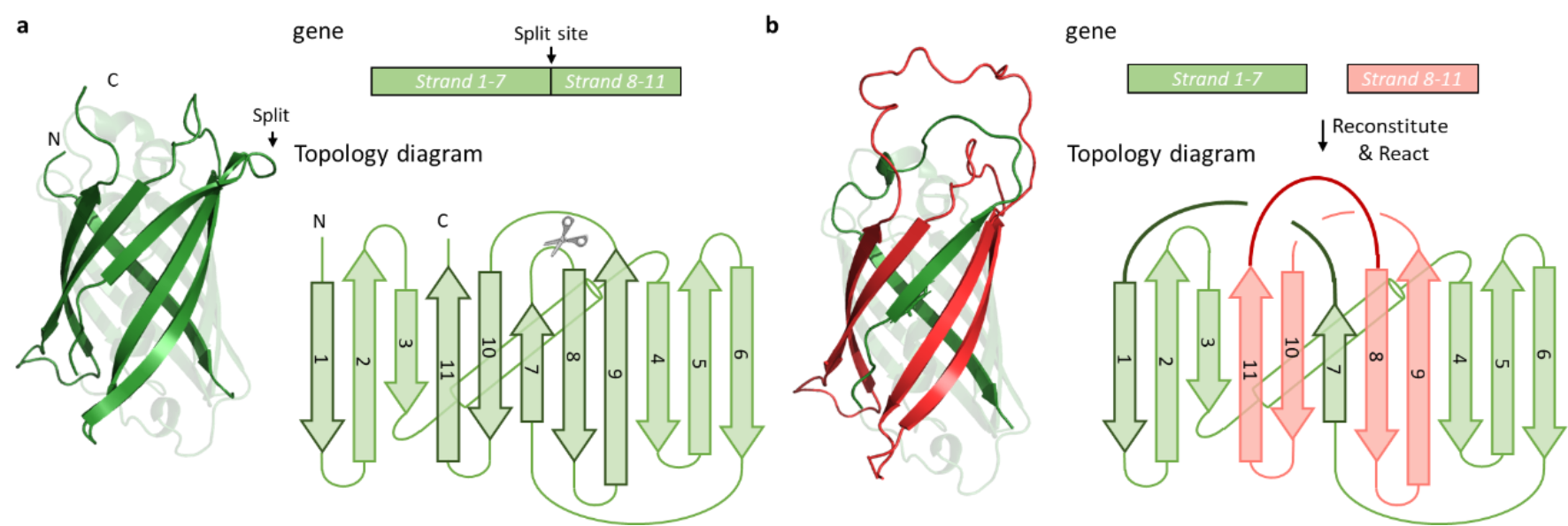 图2. a, 绿色荧光蛋白索烃的合成。b, 融合蛋白索烃的合成。