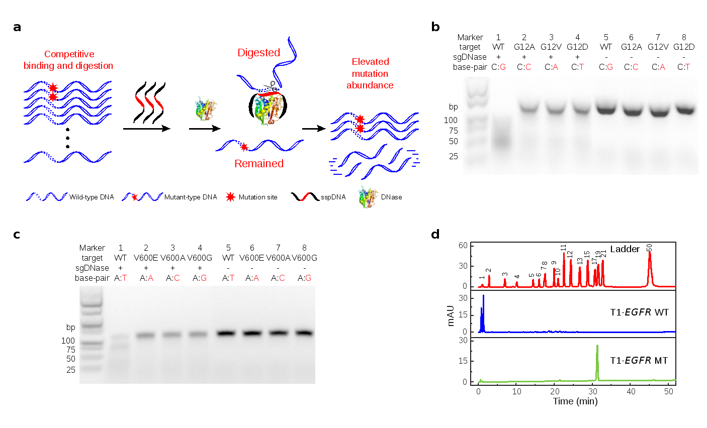 图1. (a) sgDNase对DNA分子进行序列特异性剪切的原理示意图;(b-d) sgDNase的单碱基区分能力展示:(b)KRAS G12野生链和不同突变链(KRAS G12 WT/G12A/G12V/G12D)经sgDNase水解所得产物的凝胶电泳图;(c) BRAF V600 野生链和不同突变链(BRAF V600 WT/V600E/V600A/V600G)经sgDNase水解所得产物的凝胶电泳图;(d)EGFR L858R 野生链(T1-EGFR WT)和突变链(T1-EGFR MT)经sgDNase水解产物的HPLC色谱图。