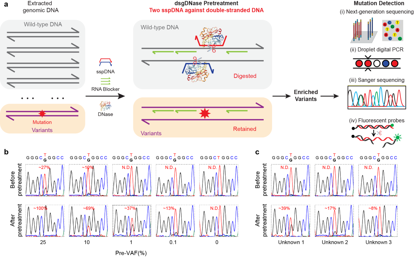 研究团队进一步设计了成对的sspDNA,用于对基因组双链DNA的直接剪切处理(图3)。初始VAFs分别为1%~10%、0.1%~1%和<0.1%的三个未知样品经过双sspDNA引导的sgDNase处理后,通过Sanger测序测得VAFs分别为39%、17%和8%。测定结果得到了ddPCR法的确证。