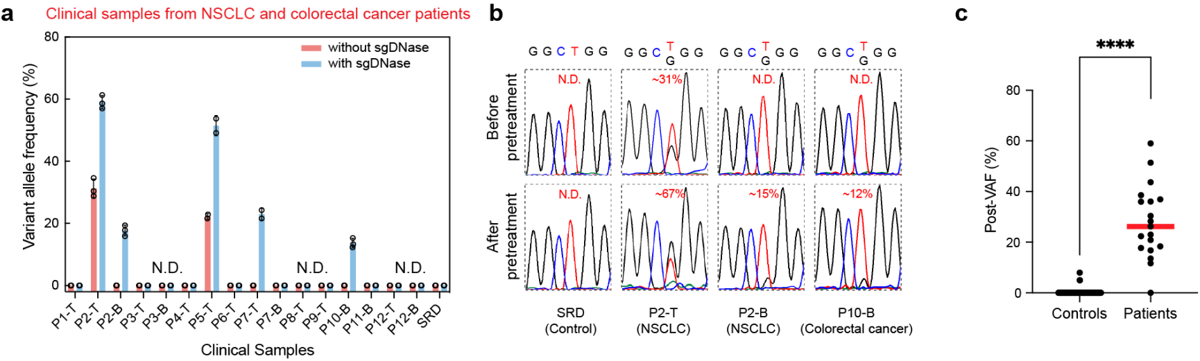 图4.(a)sgDNase用于8位NSCLC 患者(P1-P8)和4位结直肠癌患者(P9-P12)血液样本(B)和组织样本(T)中EGFR L858R突变检测的结果。(b)sgDNase处理前后部分样本中EGFR L858R 突变的测序结果。(c)sgDNase处理后癌症患者与阴性对照样本的VAFs 对比。