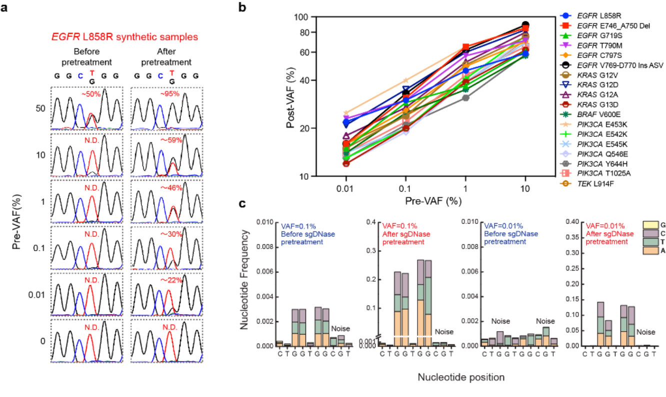 图2.(a)sgDNase处理前后,样本中EGFR L858R突变的VAF变化对比(Sanger测序结果);(b)18种常见的热点突变在经过sgDNase处理后VAF的变化对比;(c) sgDNase处理前后,样本中KRAS G12G13突变的VAF变化对比(NGS测序结果)。