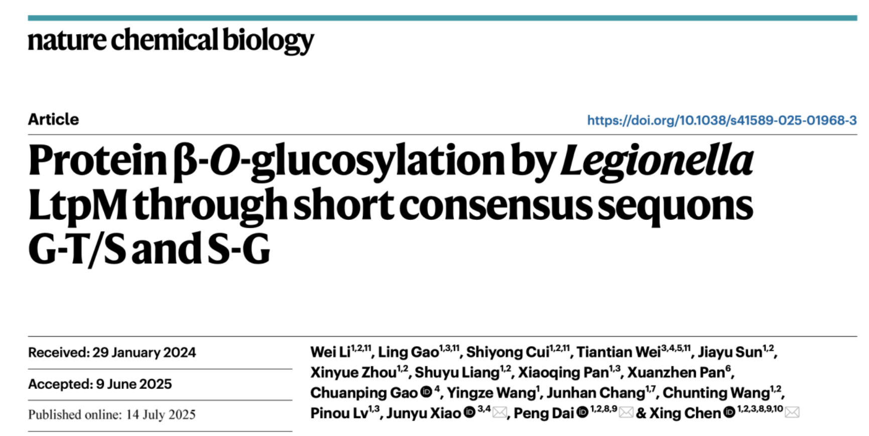 2025年7月14日,北京大学化学与分子工程学院、北大-清华生命科学联合中心陈兴/戴鹏团队与北京大学生命科学学院、北大-清华生命科学联合中心肖俊宇团队合作,在 Nature Chemical Biology 杂志发表题为“Protein β-O-glucosylation by Legionella LtpM via short consensus sequons G-T/S and S-G”的研究论文,报道了嗜肺军团菌效应蛋白 LtpM 作为 β-O-葡萄糖基(β-O-Glc)转移酶的性质和应用。该工作鉴定了 LtpM 的修饰底物,阐明了其通过识别 G-T/S、S-G 序列向许多真核蛋白定点引入 β-O-Glc 修饰的机制。通过 LtpM 这一定点引入 O-糖基化修饰的有力工具,初步揭示了 O-Glc 替代 O-GlcNAc 修饰介导液-液相分离的潜力。