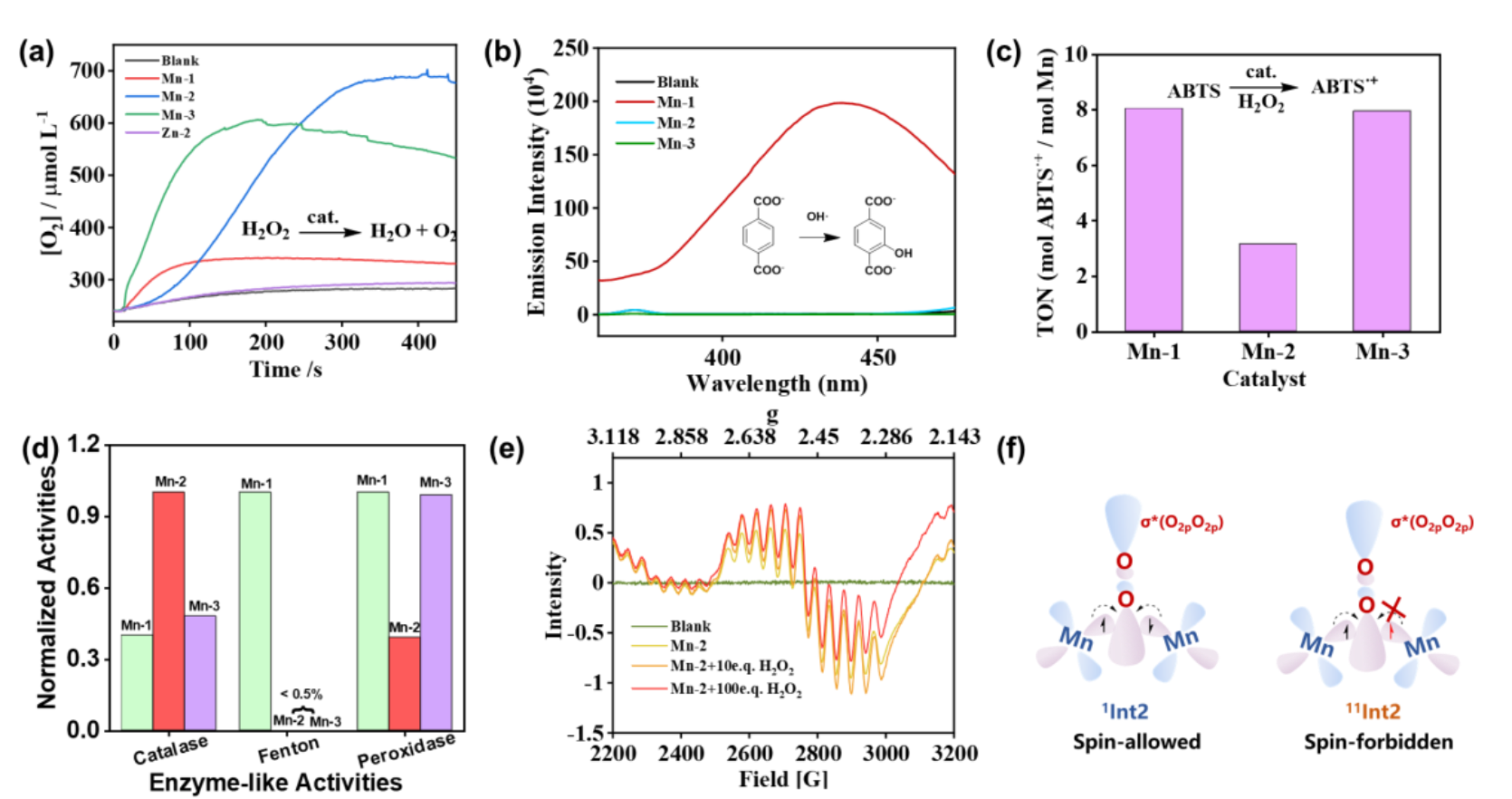 工作的亮点在于,精准设计并合成了双核锰配合物Mn-2,成功复现了天然MnCAT的核心特征:晶体结构显示Mn-Mn距离为3.18 Å,与天然酶(3.10-3.40 Å)高度吻合。磁学测量(SQUID)证实Mn-2存在弱反铁磁相互作用(J = -2.9 cm-1),这是实现协同催化H2O2的关键。通过反磁性耦合结构极化 H₂O₂的 O-O 键,实现 “清洁” 歧化(生成 H₂O 和 O₂),催化效率(以单位锰离子计)是单核配合物 Mn-1 的 3.9 倍、三核配合物 Mn-3 的 1.8 倍。理论计算(DFT)进一步揭示,反铁磁耦合使 Mn-2 可显著降低 H₂O₂分解能垒,并通过 Mn²⁺/Mn³⁺循环的双电子转移机制实现 “无副产物” 催化,避免高活性 Mn⁴⁺物种对细胞的额外损伤。