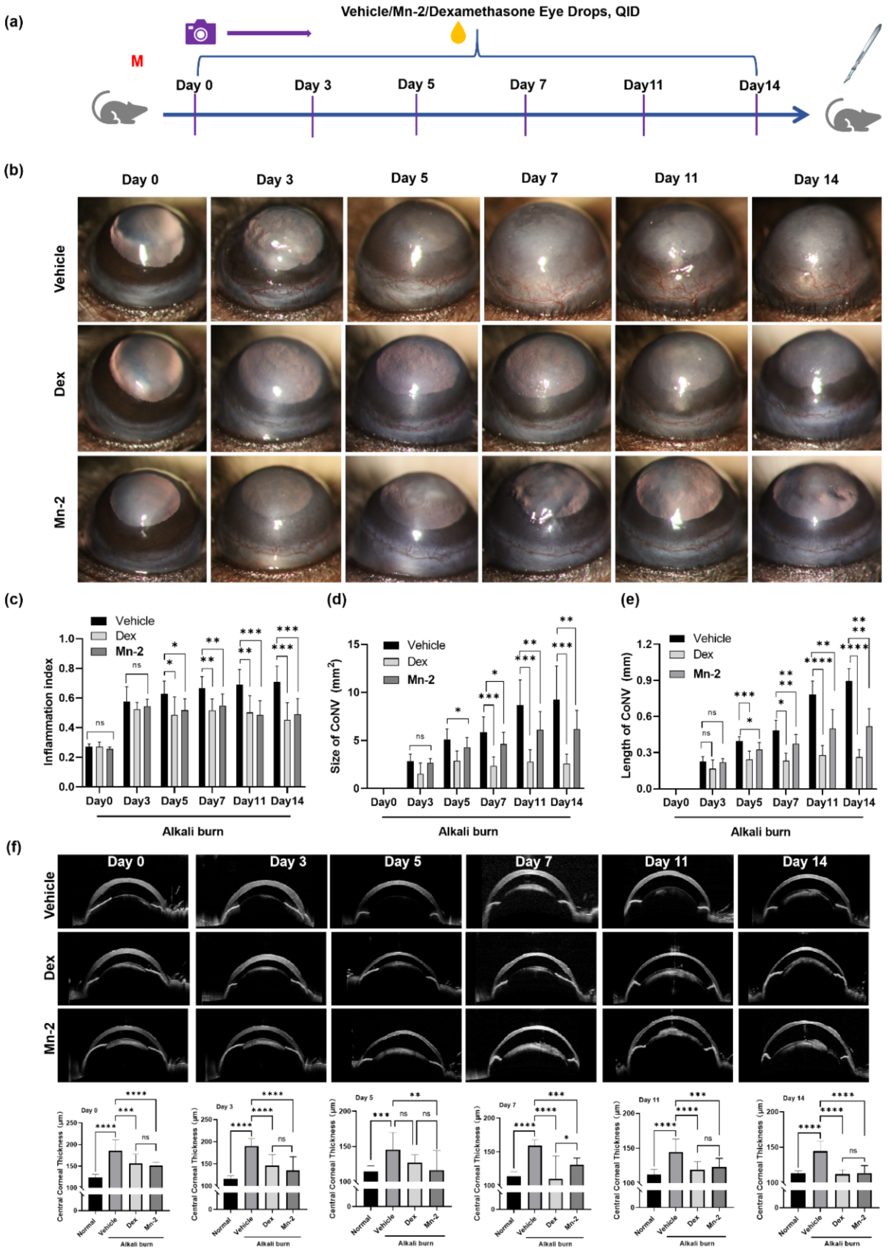 在人角膜上皮细胞(HCECs)模型中,Mn-2能有效清除H2O2诱导的ROS累积,减轻脂质过氧化(MDA水平下降),并发挥了抗氧化和抗凋亡的双重功能。 在小鼠角膜碱烧伤模型中,滴注Mn-2效果显著,显著减轻角膜炎症性水肿和混浊,效果与临床标准药物地塞米松相当。有效抑制角膜新生血管(CNV)的长度和面积。 与延缓上皮愈合的地塞米松不同,Mn-2能显著加速角膜上皮缺损的闭合,这对于预防感染和恢复视力屏障至关重要。