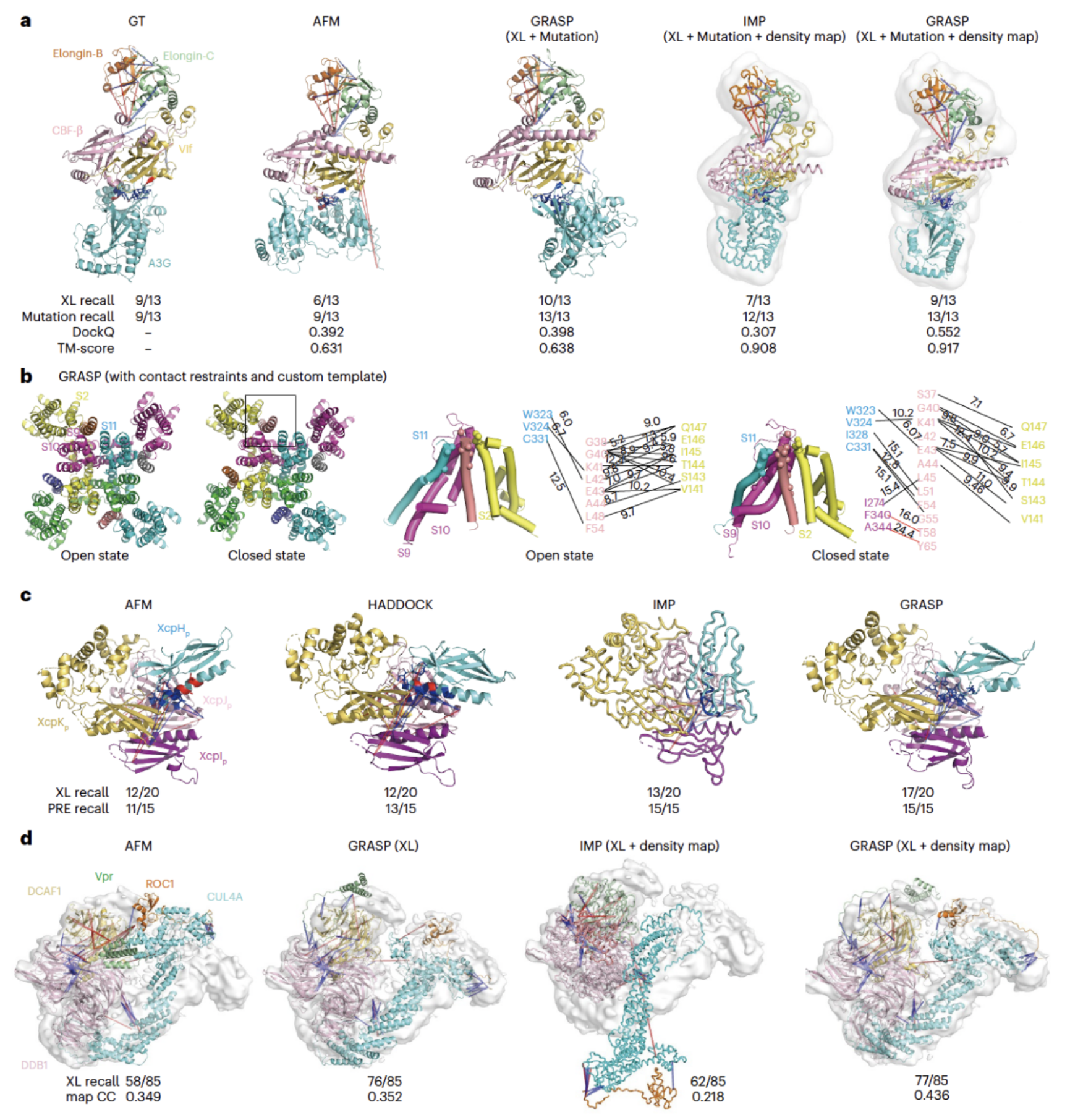 整合建模:为利用更加丰富的实验数据进行整合建模,该研究提出了Combfit工具以间接整合冷冻电镜信息。GRASP通过结合冷冻电镜密度图、XL、NMR PRE、突变和半胱氨酸桥接等实验,展示了其在四个复杂约束建模任务中的潜力。例如,在 A3G-VCBC 系统中,GRASP 结合XL、突变数据和中低分辨率冷冻电镜数据后,满足所有界面约束和 9/13 交联约束,DockQ 为0.552。