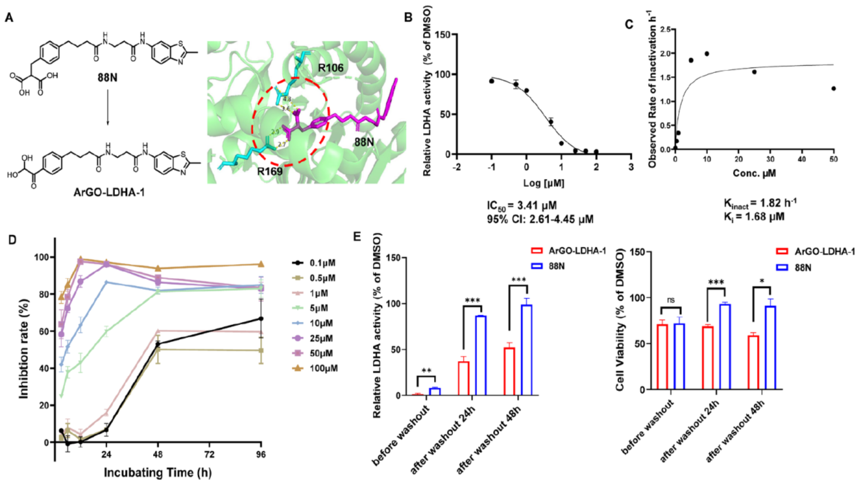 (图3)共价抑制剂ArGO-LDHA-1对LDHA具有强效、持久、不可逆的抑制活性