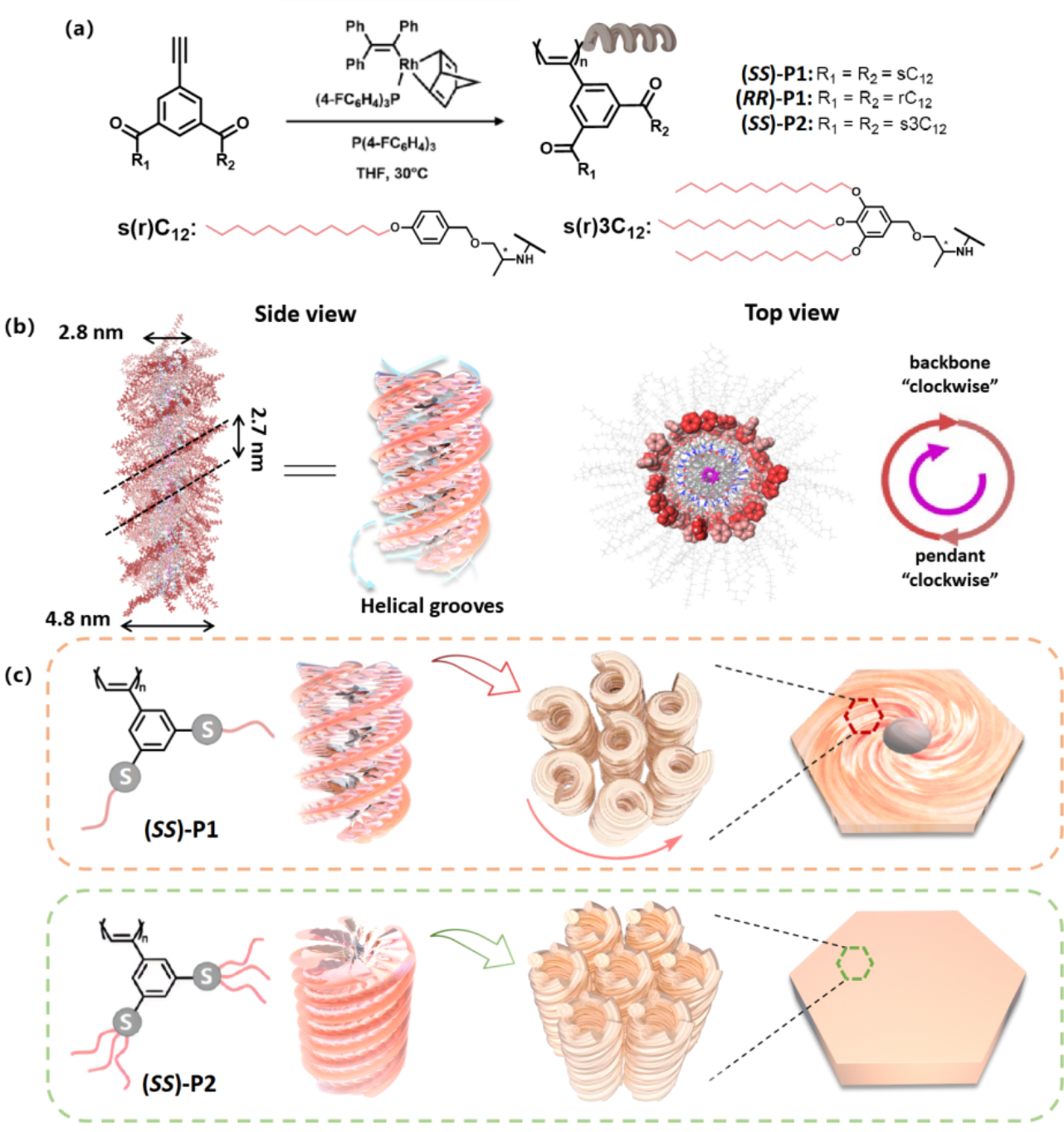 近日,北京大学张洁研究员/宛新华教授团队在J. Am. Chem. Soc.上发表了题为“Tunable Mesoscale Chirality in Two-Dimensional Vortex-like Assemblies of Helically Grooved Poly(phenylacetylene) Derivatives”的文章。她们提出一种仿生策略,以具有类似 DNA 螺旋沟槽结构的共轭聚苯乙炔衍生物为组装基元(图1),通过调控分子结构和组装动力学,在溶液中组装程涡旋状的二维组装体,实现可编程的介观手性并显著放大圆偏振发光不对称因子。