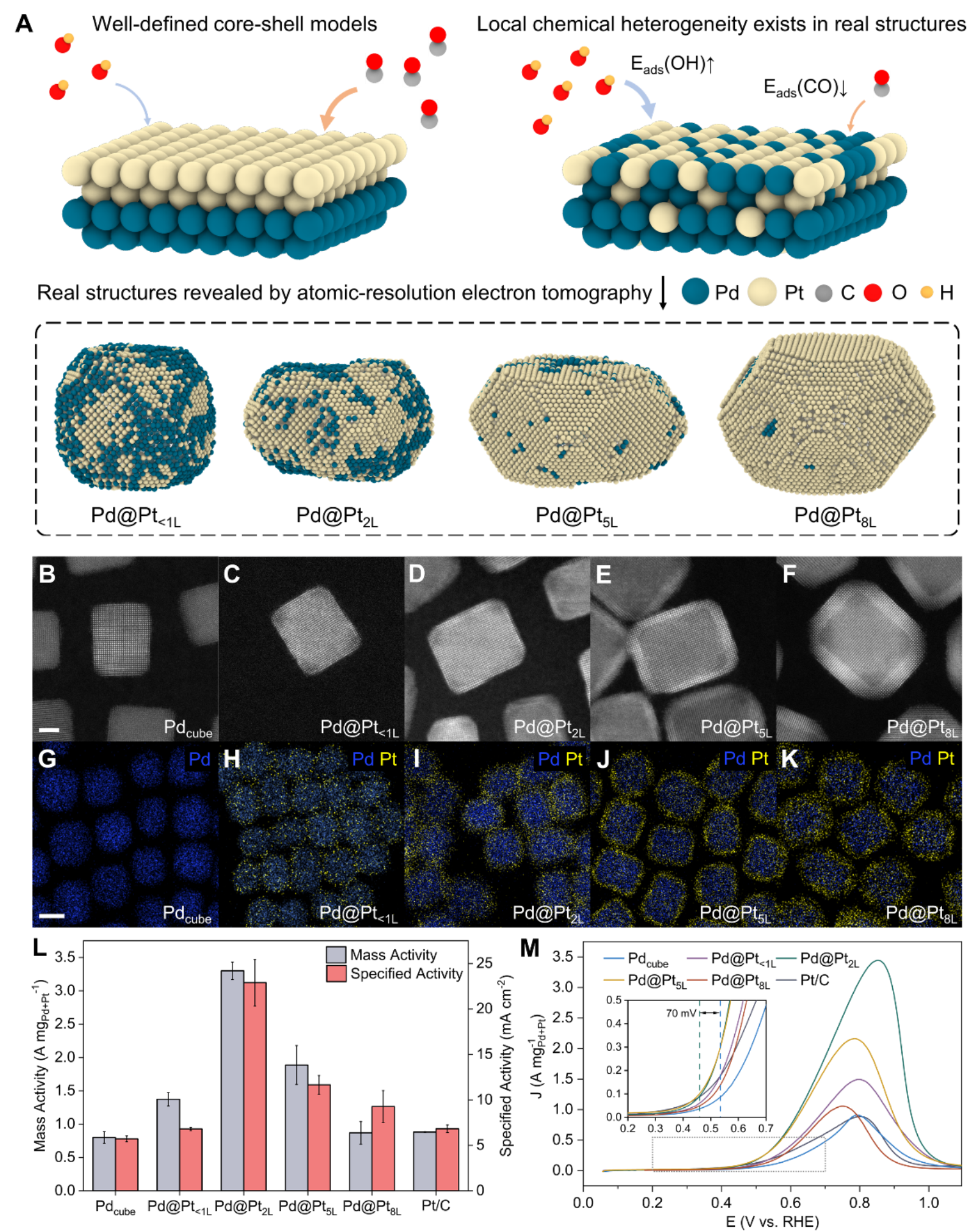 近期,课题组致力于探究次表面原子结构对于催化剂性能的影响机制。研究团队通过在高度均匀的Pd纳米颗粒上可控外延生长Pt层,精确合成了四种具有不同Pd-Pt界面扩散程度的Pd@Pt纳米颗粒,并通过AET精确测定了其三维原子结构;探针反应(电催化乙醇氧化反应, EOR)测试结果表明四种纳米催化剂具有火山形性能趋势(图1)。