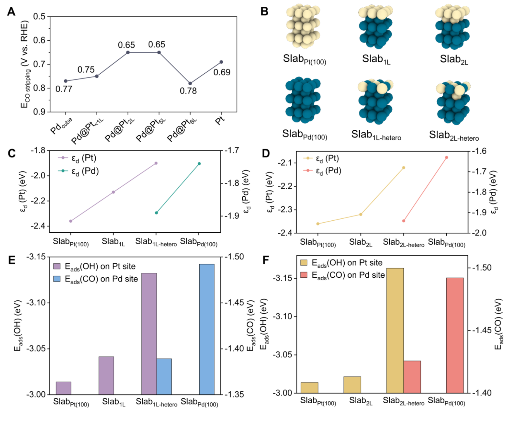 CO电化学脱附实验与密度泛函理论(DFT)计算进一步揭示:在壳层厚度影响的基础上,Pd@Pt界面原子扩散可使表面原子位点的d带中心进一步发生移动,强化了表面Pt位点的OH吸附,同时弱化了表面Pd位点的CO吸附——这些均有利于提升EOR性能。