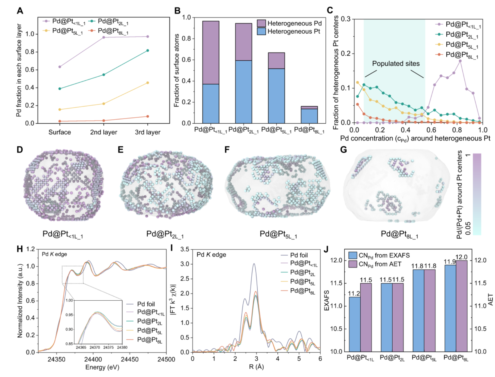 团队进一步定量测定了四种Pd@Pt纳米催化剂表面及次表面的扩散Pd浓度与局域化学异质程度,发现Pt位点周围特定程度的局部化学异质性可促进Pd向Pt的电子转移。同步辐射X射线吸收精细结构(XAFS)测试提供的宏观尺度结构信息进一步验证了AET的这一结论(图2)。