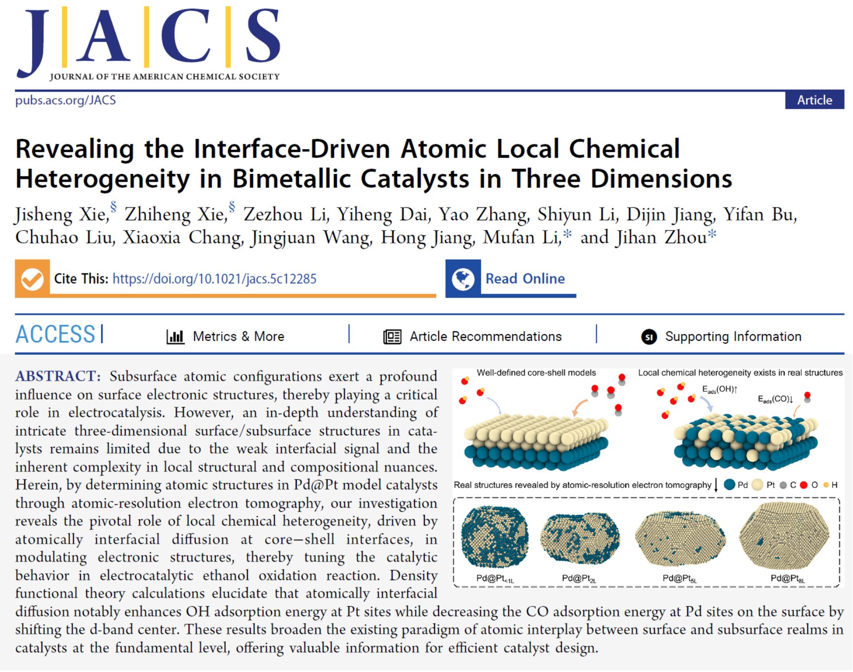 2025年10月31日,北京大学化学与分子工程学院周继寒课题组与李慕凡课题组合作在Journal of the American Chemical Society上发表了题目为“Revealing the interface-driven atomic local chemical heterogeneity in bimetallic catalysts in three dimensions”的研究论文。在该项工作中,作者通过原子分辨电子三维重建技术(AET)精准解析了具有不同界面扩散程度的Pd@Pt核壳纳米颗粒的三维原子结构,量化了由此驱动产生的近表面局域化学异质性,成功揭示了纳米催化剂中次表面原子结构对于催化性能的关键影响。