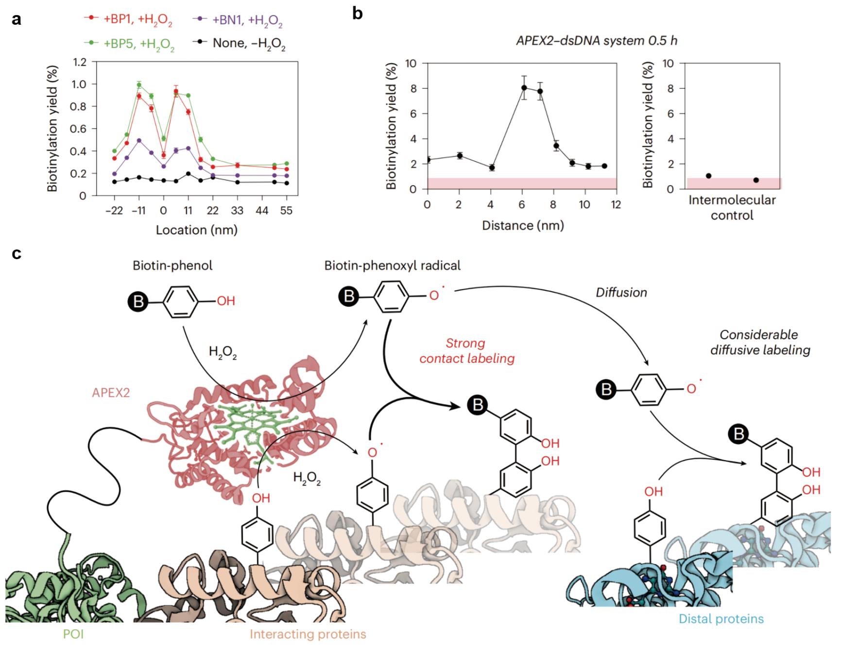 图2. 利用DNA纳米尺平台对APEX2的作用范围进行测量。a. APEX2-DNA折纸体系的测量结果。b. APEX2-dsDNA体系的测量结果。c. 该研究提出的APEX2的标记机制,同时表现出接触标记与扩散标记。
