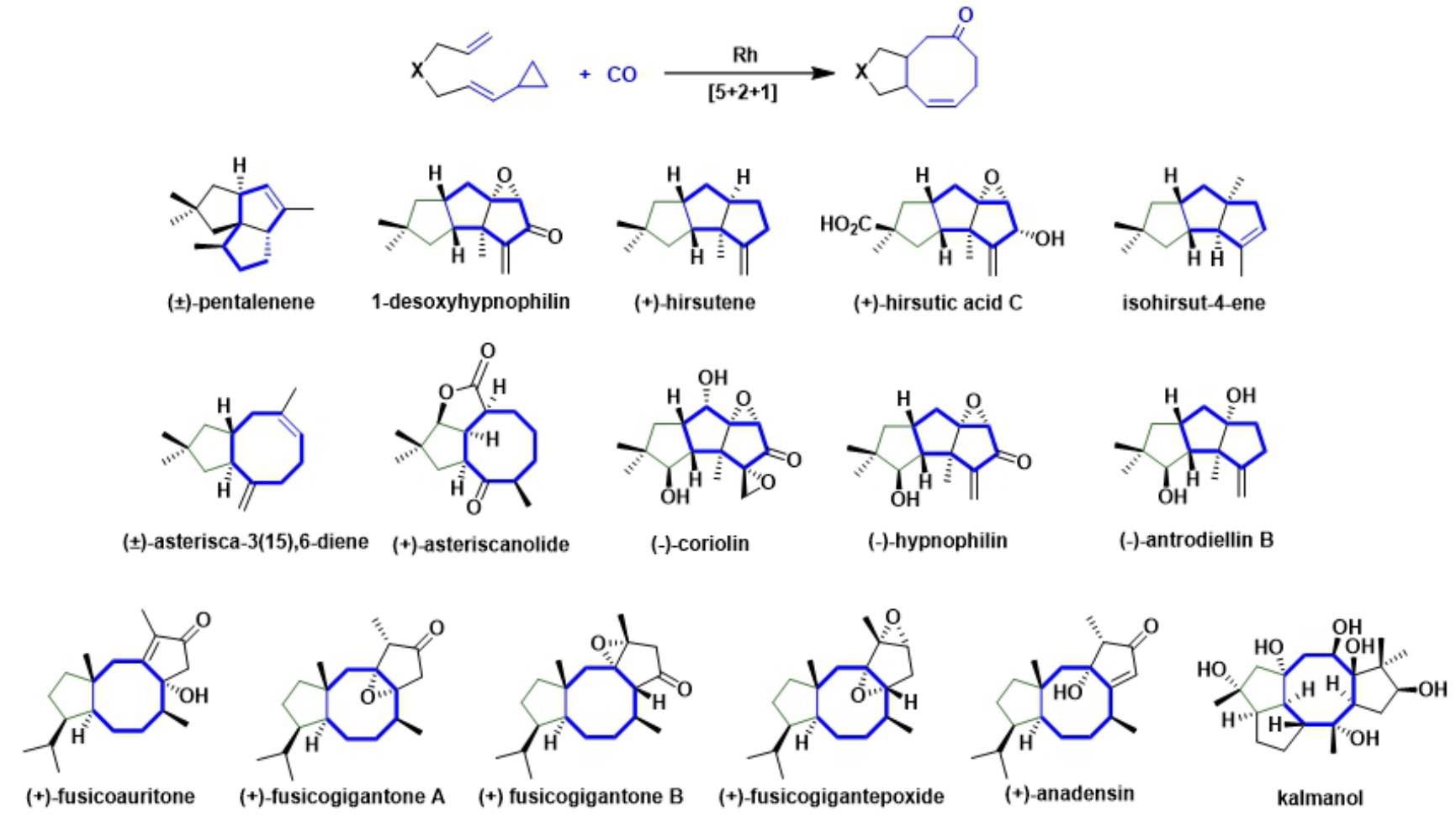 图1. 基于[5+2+1]环加成反应的天然产物全合成例子