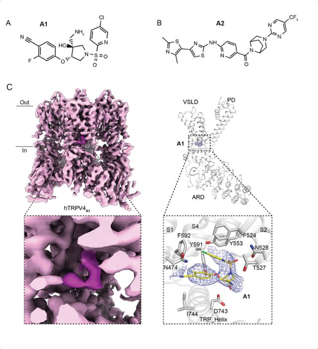 The nonselective calcium-permeable Transient Receptor Potential Cation Channel Subfamily V Member4 (TRPV4) channel regulates various physiological activities. Dysfunction of TRPV4 is linked to many severe diseases, including edema, pain, gastrointestinal disorders, lung diseases, and inherited neurodegeneration. Emerging TRPV4 antagonists show potential clinical benefits. However, the molecular mechanisms of TRPV4 antagonism remain poorly understood. Here, cryo-electron microscopy (cryo-EM) structures of human TRPV4 are presented in-complex with two potent antagonists, revealing the detailed binding pockets and regulatory mechanisms of TRPV4 gating. Both antagonists bind to the voltage-sensing-like domain (VSLD) and stabilize the channel in closed states. These two antagonists induce TRPV4 to undergo an apparent fourfold to twofold symmetry transition. Moreover, it is demonstrated that one of the antagonists binds to the VSLD extended pocket, which differs from the canonical VSLD pocket. Complemented with functional and molecular dynamics simulation results, this study provides crucial mechanistic insights into TRPV4 regulation by small-molecule antagonists, which may facilitate future drug discovery targeting TRPV4.
