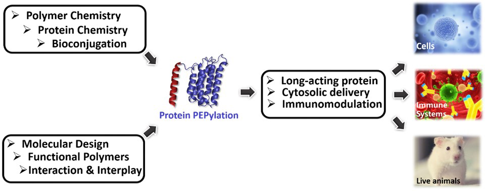 Proteins are biological macromolecules with precise structure, hierarchical folding, and versatile functions. However molecules with such delicate structures are intrinsically vulnerable to environmental stresses including heat, pH, and organic solvents, making their broad applications inconvenient and costly. Particularly, the pharmacological performance of protein drugs often suffer from rapid proteolytic degradation, renal filtration, and strong immunogenicity. To this end, the overarching goal of the Lu lab at Peking University is to develop tools for the controlled synthesis of novel biomimetic polymers and protein conjugates to address unmet biomedical needs. To do this, we integrate and harness the power of organic/polymeric synthesis, molecular design, protein engineering, nanotechnology, and advanced biotechnologies. On this theme, we have been rigorously pursuing three focused directions outlined below: