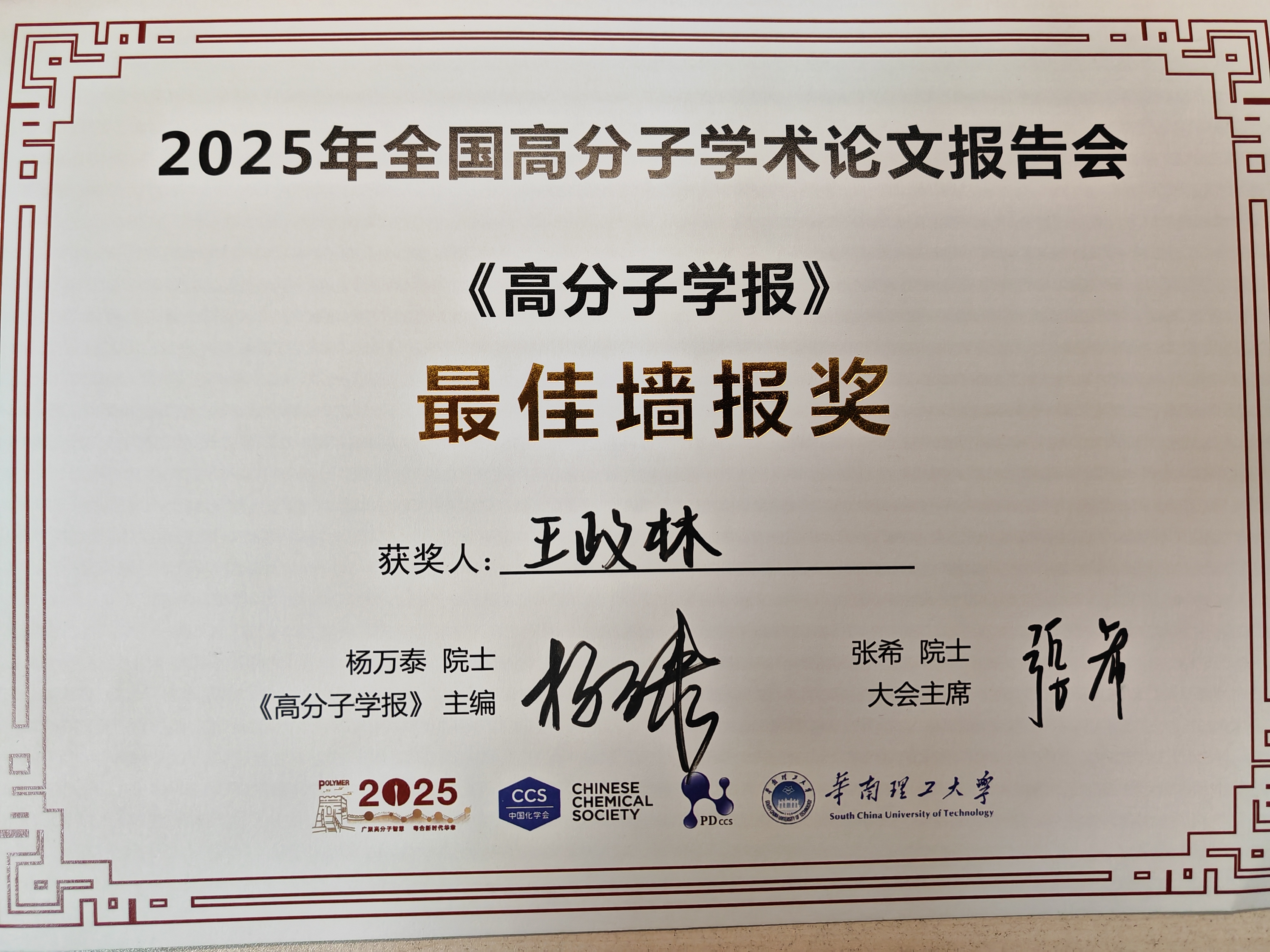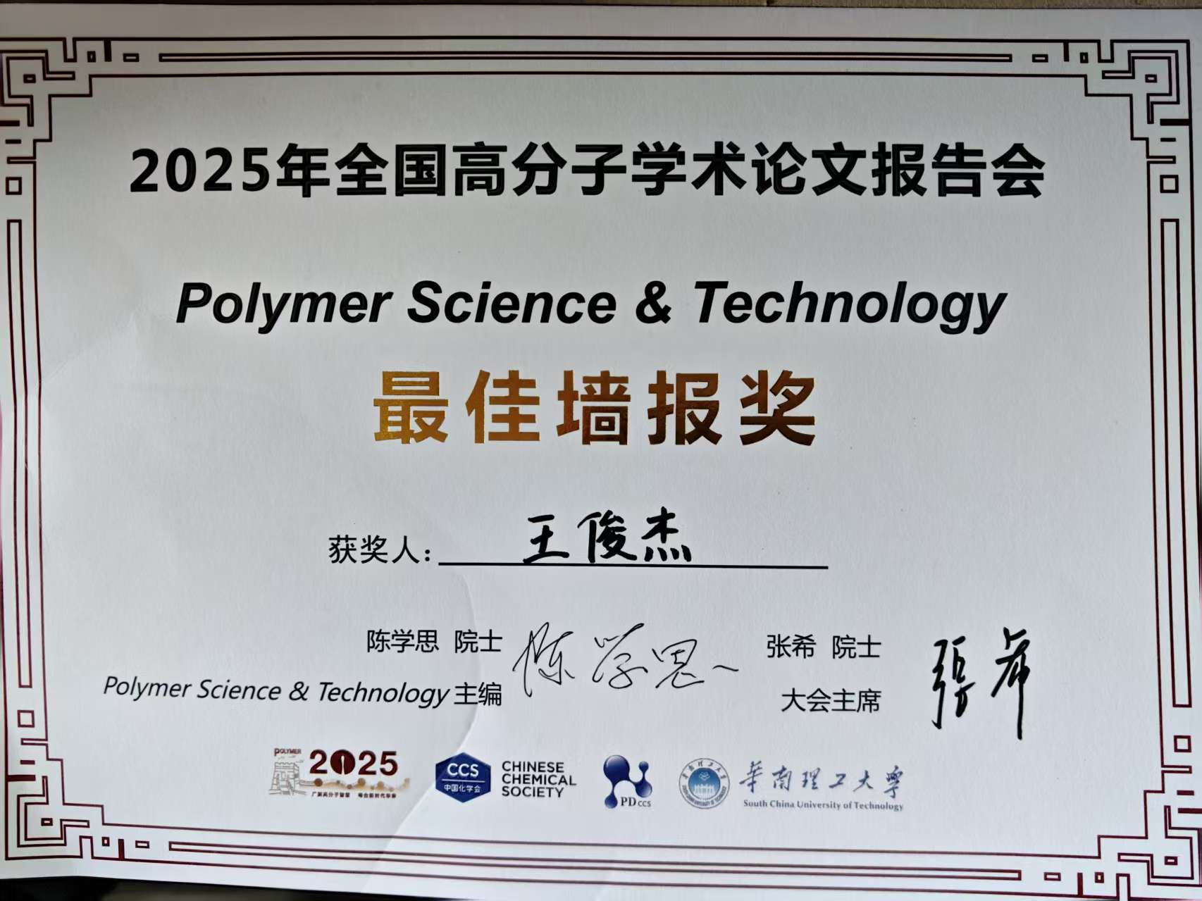 In November, Jun-Jie, Zheng-Lin, and Hao-Ze presented their latest research in polymer chemistry at the 2025 National Polymer Academic Paper Conference in Guangzhou. Among all poster presentations, both Jun-Jie and Zheng-Lin were selected as Poster Award recipients. Congratulations!