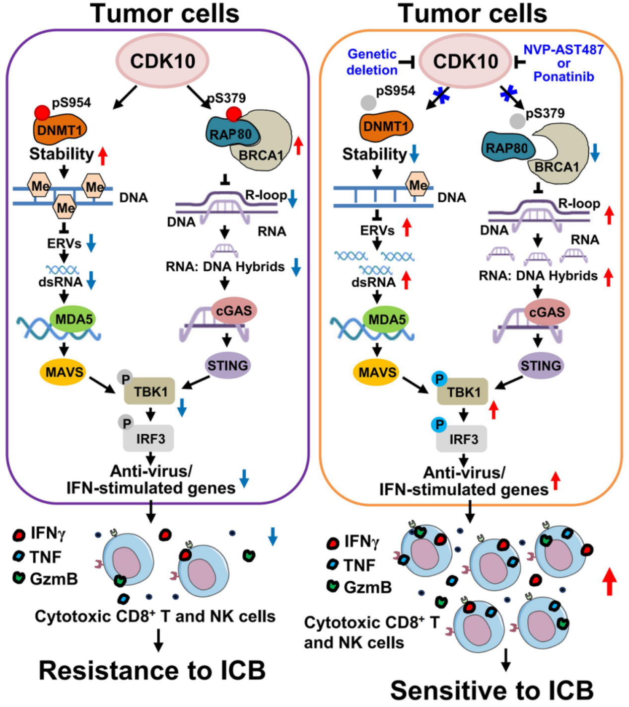 在该研究中,合作团队通过体内激酶组 CRISPR/Cas9 筛选,系统性鉴定出 CDK10 是肿瘤免疫监视的关键负调控因子。功能实验证明其激酶活性是促进免疫逃逸所必需的。多组学分析表明,敲除 CDK10 可重塑肿瘤微环境、增强免疫活化,并依赖 CD8⁺ T 和 NK 细胞抑制肿瘤生长。机制研究发现,CDK10 可磷酸化表观调控因子 DNMT1 和 DNA 损伤修饰因子 RAP80 ,分别抑制细胞中 dsRNA 与 R-loop 积累,从而阻断 MDA5 和 cGAS 介导的天然免疫激活,促进免疫逃逸。