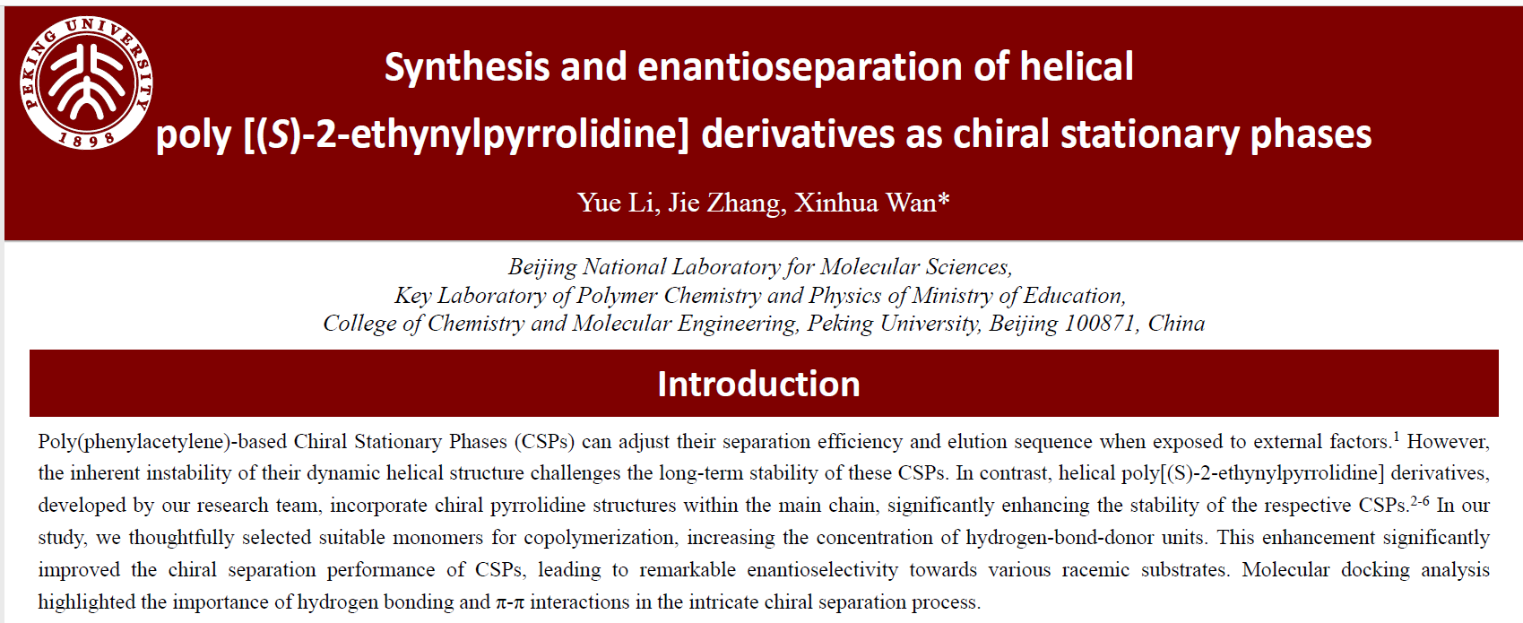 李悦同学展示了关于“螺旋聚[(S)-2-乙基吡咯烷]衍生物的合成与对映体分离”的研究成果。她的工作不仅在展现上极具亮点,而且在墙报展示期间,她还积极与业内同行进行了深入的交流和探讨。凭借优秀的研究成果和热情的学术互动,该同学获得了“优秀墙报奖”的荣誉。