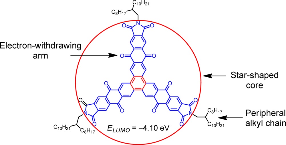 3. A star-shaped molecule with low-lying lowest unoccupied molecular orbital level, n-type panchromatic electrochromsm, and long-term stability.