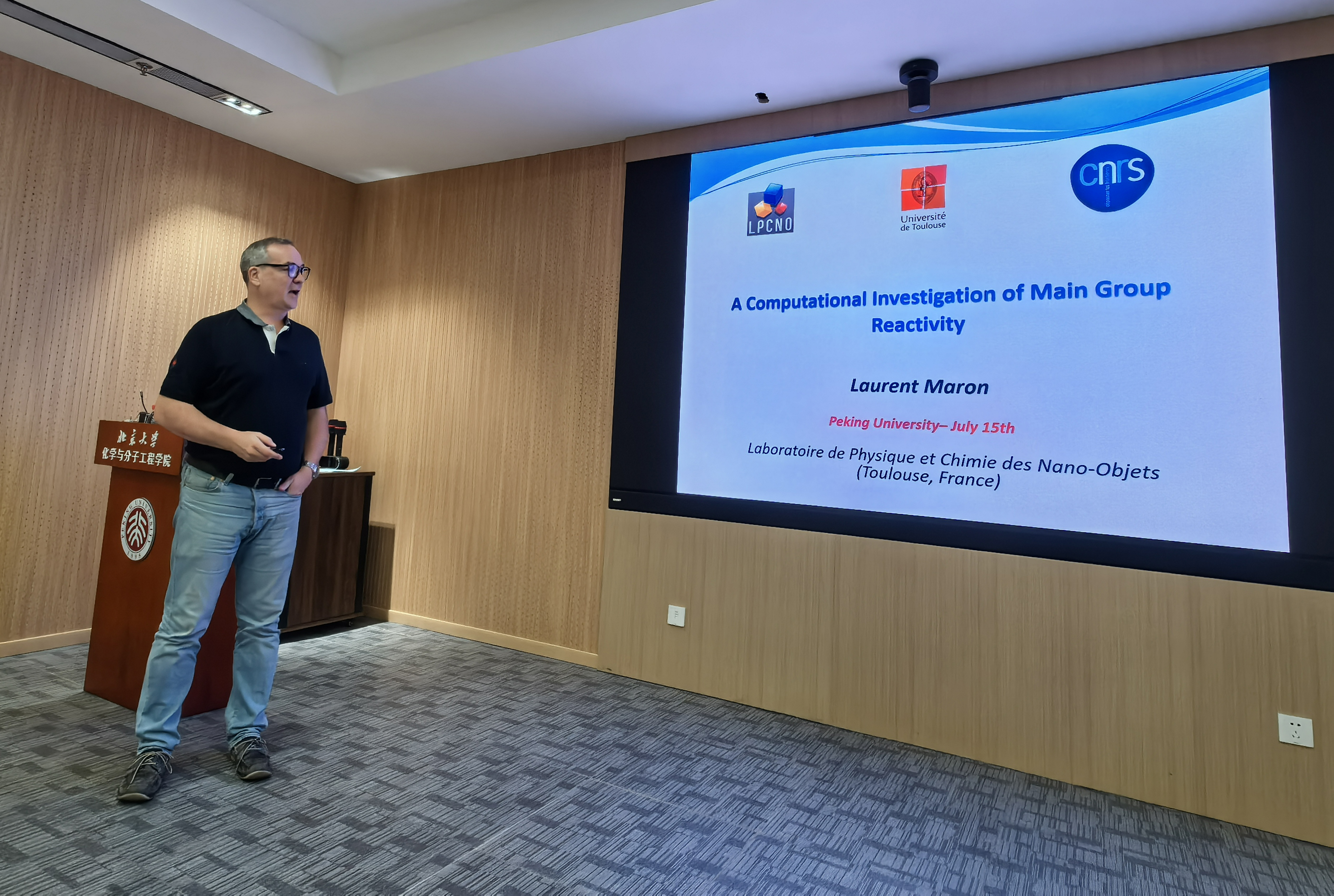 On July 15th, Prof. Laurent Maron from France visited Peking University at the invitation of Prof. Zhang. In the afternoon, he toured our lab and poster displays under Prof. Zhang’s guidance and took group photos with us. Afterwards, he had discussions with Prof. Zhang and students about their respective research projects and offered many valuable suggestions. At 4 p.m., Prof. Maron gave an excellent lecture in conference room CB213 on the reactivity and catalysis of main group molecules. We sincerely thank Prof. Maron for his visit!