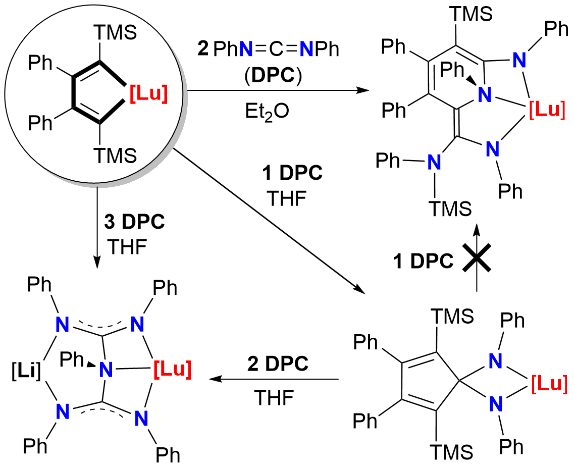 121. Ling Xu, Junnian Wei, Wen-Xiong Zhang*, and Zhenfeng Xi, Insertion/Rearrangement Reactivity of a Lutetacyclopentadiene towards N,N'-Diphenylcarbodiimide: Cooperative Effect of the Metal Center, Concentration of LiCl, and Solvent,