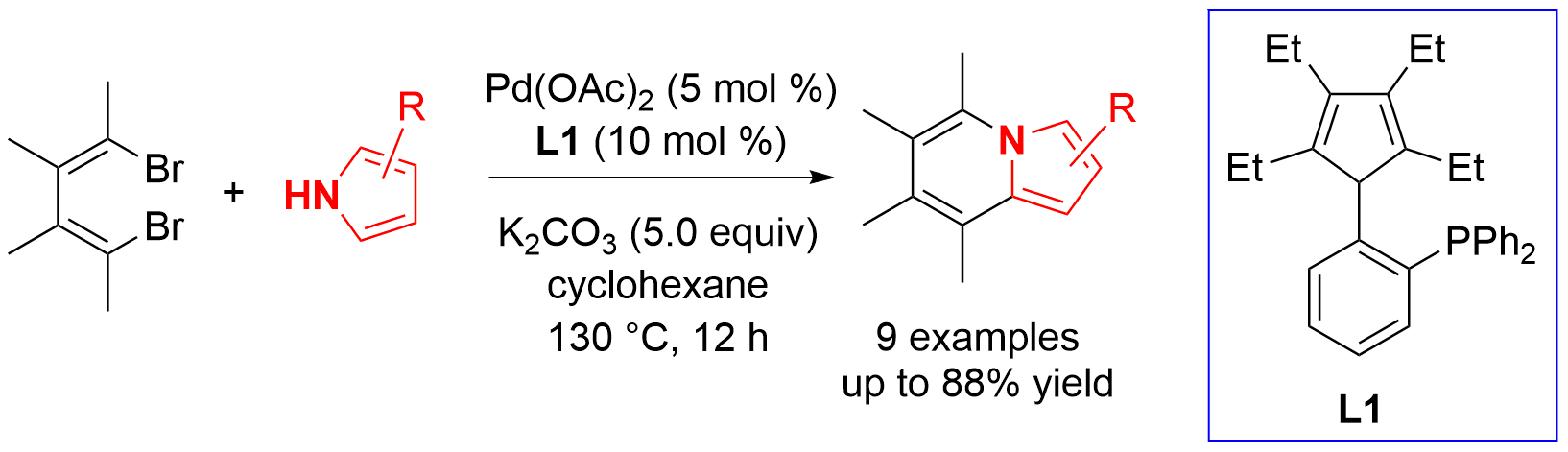 109. Wei Hao, Han Wang, Qingyu Ye, Wen-Xiong Zhang, and Zhenfeng Xi*, Cyclopentadiene-Phosphine/Palladium-Catalyzed Synthesis of Indolizines from Pyrrole and 1,4-Dibromo-1,3-butadienes,
