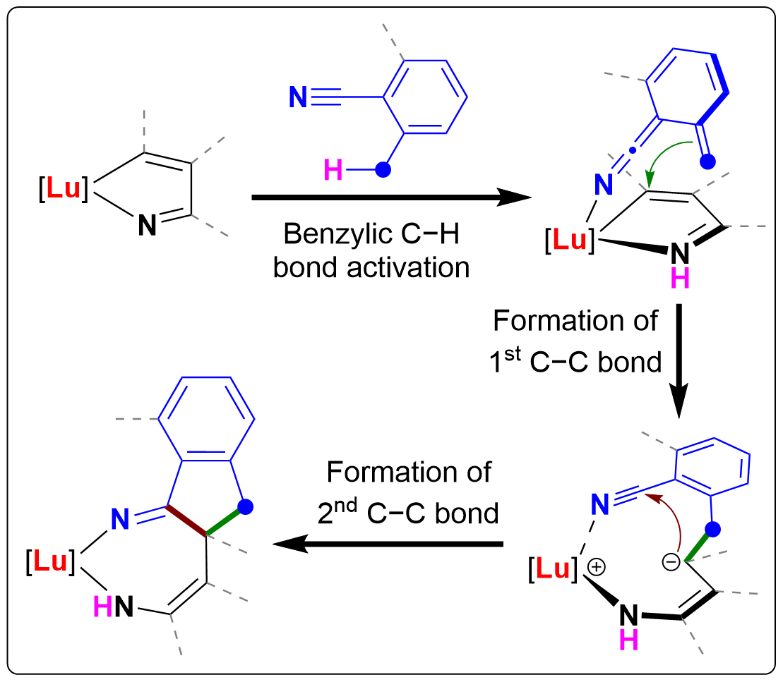 Azametallacyclopentadienes are an important class of metallacycles as the key intermediates in metal-promoted or catalyzed carbon-carbon coupling reaction of nitriles and alkynes. Rare-earth azametallacyclopentadienes have shown various reactivity toward nitriles, depending on the substituents of nitriles. The reaction of azalutetacyclopentadienes toward 2-methylbenzonitriles has been investigated in this work, which selectively affords the fused 7-5-6-membered azalutetacycles as products. Computational studies reveal that the reaction of azalutetacyclopentadienes toward 2-methylbenzonitriles selectively initiates with the remote activation of the benzylic C−H bond by the Lu−N bond, followed by the intramolecular nucleophilic attack from the deprotonated benzylic carbon to form a C−C bond. Subsequently, the high ring strain promoted the generation of the uncoordinated carbanion dissociated from the lutetium center, which then undergoes intramolecular nucleophilic attack toward C≡N triple bond to give the final product containing fused 7-5-6-membered azalutetacycle. This work not only achieves highly selective three-step cascade reaction to form a unique class of rare-earth metallacycle, but also provides a new idea for the transformation of unsaturated substrates with C−H bonds that can be activated.