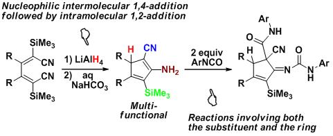 By treatment with LiAlH4, 1,4-dicyano-1,4-bis(trimethylsilyl)-1,3-dienes underwent a novel hydride-induced nucleophilic intermolecular 1,4-addition to the a, b-unsaturated nitrile moiety, followed by an immediate nucleophilic intramolecular 1,2-addition to the remaining CN group, to afford multiply functionalized cyclopentadienes in high isolated yields. These multi-functional (-CN, -NH2, -SiMe3, -H) cyclopentadienes are of a rich and interesting reaction chemistry as preliminarily demonstrated by their reaction with ArNCO involving both the substituent and the ring.