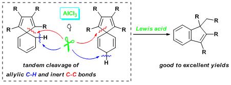 Mediated by AlCl3, substituted spiro[4.5]deca-tetraenesunderwent novel and selective skeletal rearrangement to generate indene derivatives in high to excellent yields.Selective cleavage of C-C and C-H bond is of great importance both fundamentally and practically. Sequential cleavage of both C–C and C–H bonds in all-carbon cyclic compounds spiro[4.5]deca-tetraenes was achieved to generate indene derivates via a novel AlCl3-mediated process.This work has the following two features. (1) First example on the cleavage of C-C and C-H bond of all-carbon spiro compounds; (2) A new protocol on cleavage of C-C and C-H bond.