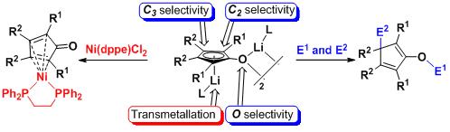 Isolation and applications of OCp: Novel cyclic dianions, lithio oxycyclopentadienyl dianions were isolated in high yields and structurally characterized by X-ray single crystal structural analysis. Interesting reaction chemistry and useful synthetic applications of these cyclic dianions were demonstrated to afford cyclopentadienes or transition-metal complexes.Cyclic dianions are very important synthetically useful intermediates for construction of organic compounds and organometallic complexes. However, synthetic methods and structural information for cyclic dianions are very much limited.This paper reports the first isolation and X-ray structural characterization of novel oxy-cyclopentadienyl (OCp for short) dianions generated via a concise reaction of 1,4-dilithio-1,3-butadienes with CO. The concomitance of the CpLi moiety, the exocyclic oxy anion, and those multi-reactive sites makes such dianion species structurally very unique and of novel reaction chemistry. -