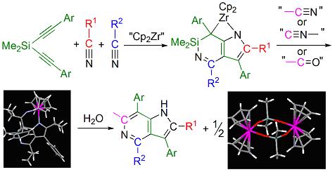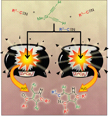 A zirconocene-mediated one-pot multi-component synthesis process has been developed, leading to the synthesis of 5-azaindoles and pyrrole derivatives, from a Si-tethered diyne and three or two different or identical organonitriles. 5-Azaindoles and pyrrole derivatives of diversified structures and substitution patterns could be highly selectively prepared via this protocol. A wide variety of organonitriles and Si-tethered diynes, either aliphatic or aromatic with both electron-withdrawing groups and electron-donating groups, could be used to afford 5-azaindoles and/or pyrroles in good-to-excellent isolated yields. A key intermediate formed in the Cp2Zr(II)-mediated reaction of one (PhC≡C)2SiMe2, two molecules of i-PrCN and one p-TolylCN was characterized by X-ray single-crystal structural analysis, which has allowed us to gain a good understanding of the reaction process. -