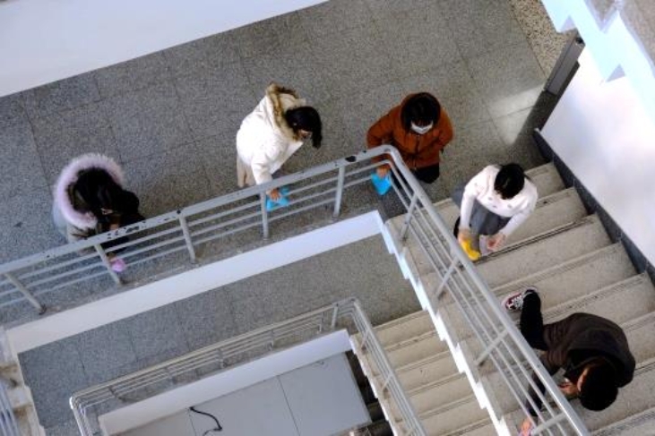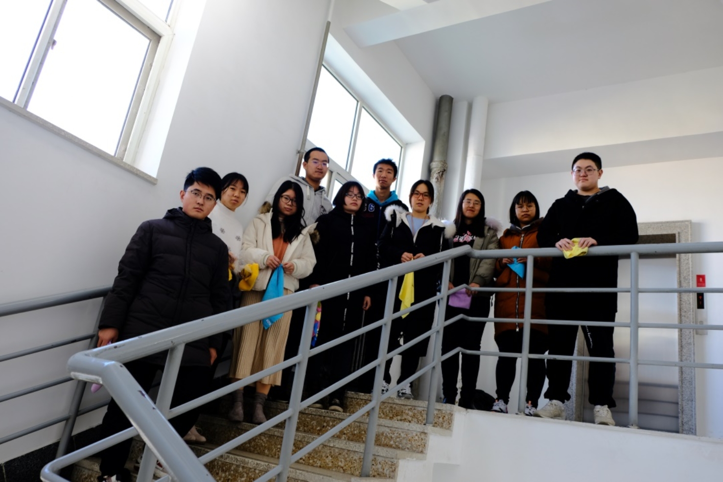 图2:支部同学团结协作擦拭化学楼B区扶手