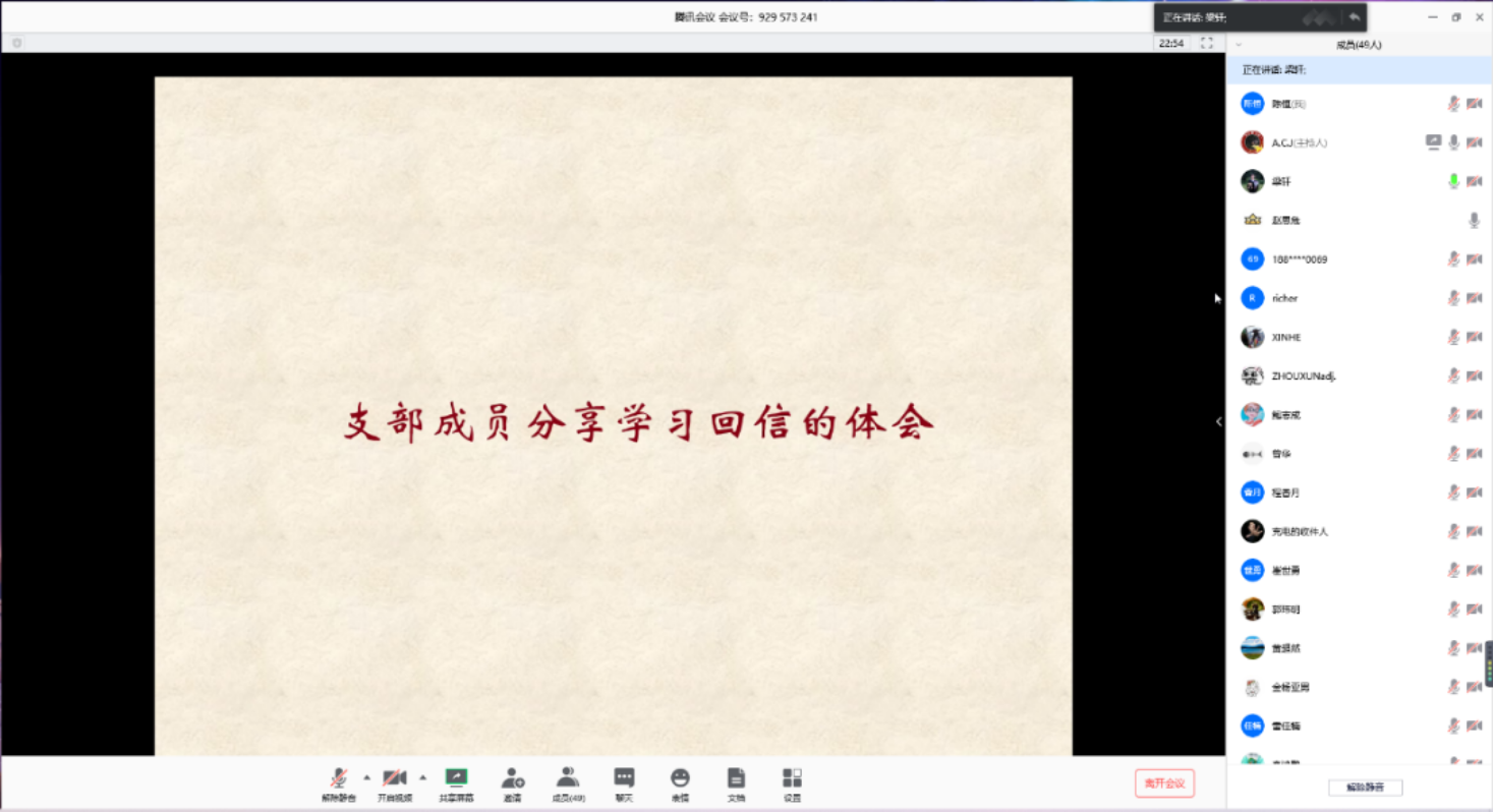 3月29日下午3点,化学与分子工程学院2019级研究生党支部通过腾讯会议召开了2020年春季学期第二次线上支部大会----习总书记“回信”精神学习,支部49名党员和积极分子参加本次会议。会议由党支部书记詹佶睿主持。