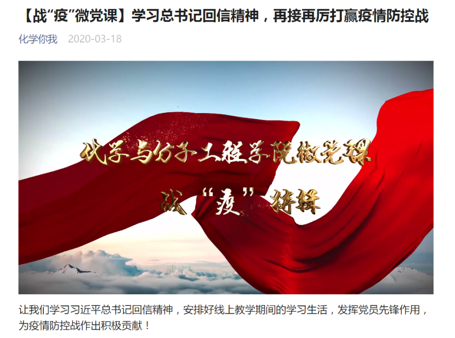 2020年3月27日下午,化学与分子工程学院物理-理论化学党支部成功举行了以“新时代青年党员的使命与担当”为主题的线上支部大会,支部全体39名党员和积极分子参加了本次会议,会议由党支部书记金灿主持。