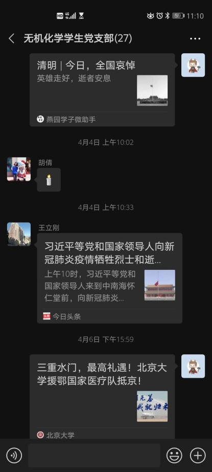 在积分赛期间,各位支部成员可以随时查看自己在学习组内的排名,大家不仅充分利用“学习强国”平台上的各种资源加强理论学习,还积极展开相关线上分享讨论。清明节全国哀悼活动、北京大学援鄂医疗队抵京等新闻事件引起大家高度关注。