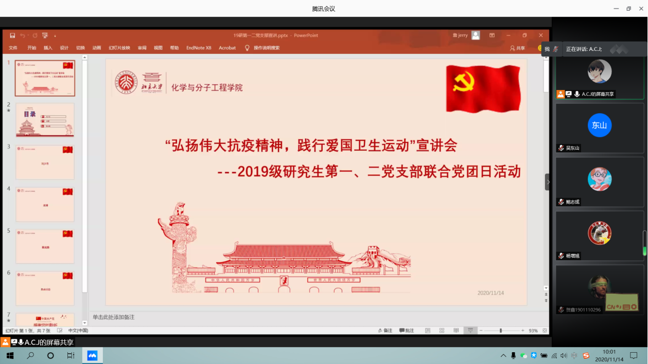 2020年11月13至14日,北京大学化学与分子工程学院2019级研究生第一、第二党支部联合举办“弘扬伟大抗疫精神,践行爱国卫生运动”主题党团日系列活动。活动由2019级研究生第一党支部书记詹佶睿主持,两个支部共54位成员踊跃参与。
