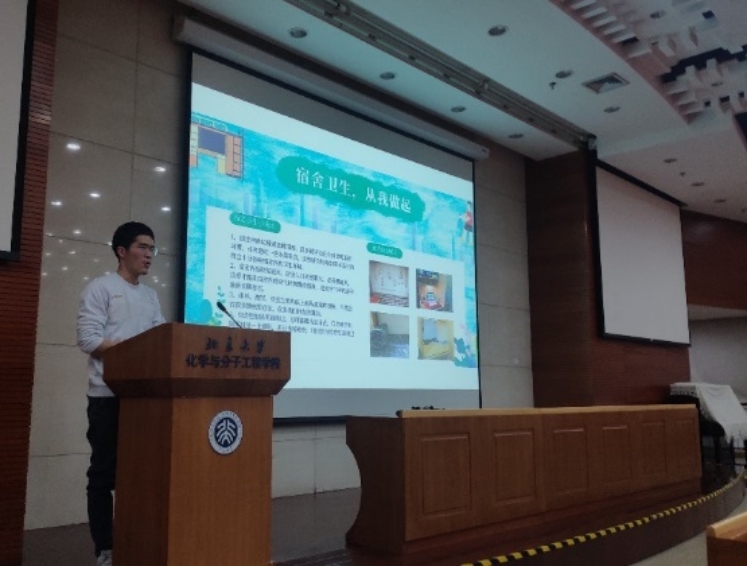 首先,前两组的同学着眼于不同地点,就“保持良好卫生习惯,维护美好校园环境”这一主题进行了分享。第一小组通过带头开展“宿舍卫生,从我做起”主题活动,营造了舒适整洁的学习生活环境,并号召同学们在秋冬季节更应注意及时清倒垃圾、开窗通风,防范各类传染疾病。第三小组则向大家介绍了在实验室、学习室、电梯间等场所的应注意的卫生事项,强调要及时处理实验室废液,定期对个人物品进行消毒。