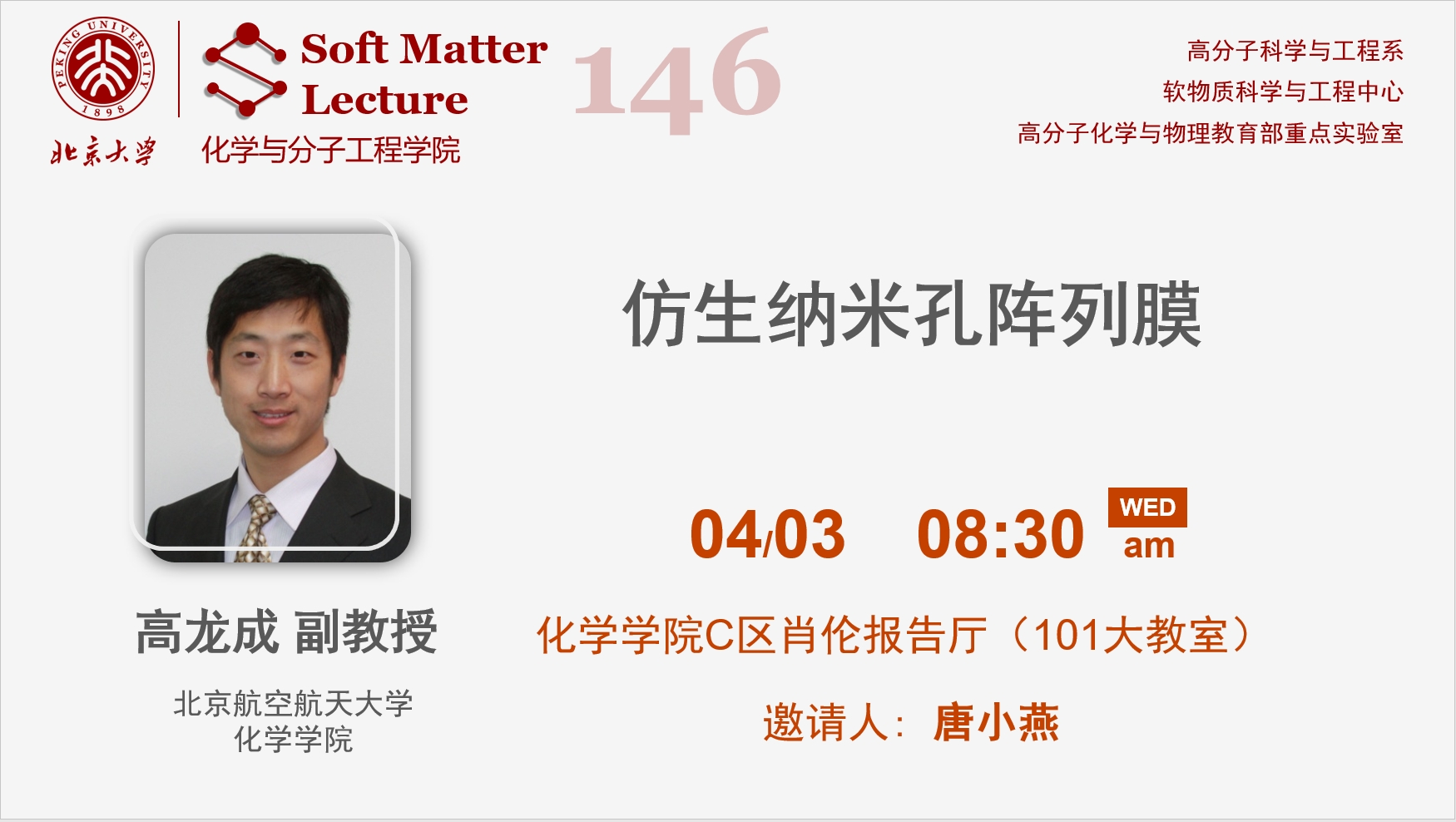 报告⼈简介:高龙成,副教授,博⼠⽣导师。2008年在北京⼤学化学学院获得博士学位,师从范星河教授、周其凤院士;2008年-2009年在法国斯特拉斯堡⼤学从事博⼠后研究,合作导师是J. C. Voegel教授。2009年⼊职北京航空航天⼤学化学学院。主要从事仿⽣⾼分⼦多孔膜的研究。近年来在J. Am. Chem. Soc. (3篇)、Sci. Adv.(1篇)、Nat. Nanotechnol. (1 篇)、Nat. Commun. (2篇)、Adv. Mater. (4篇)、Angew. Chem.(2篇)等发表SCI论⽂60余篇,论⽂总他引2500余次,3篇论⽂⼊选ESI⾼被引论⽂, 1篇论⽂被Science亮点报道;授权发明专利4项。