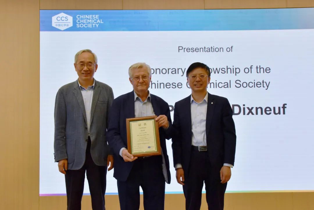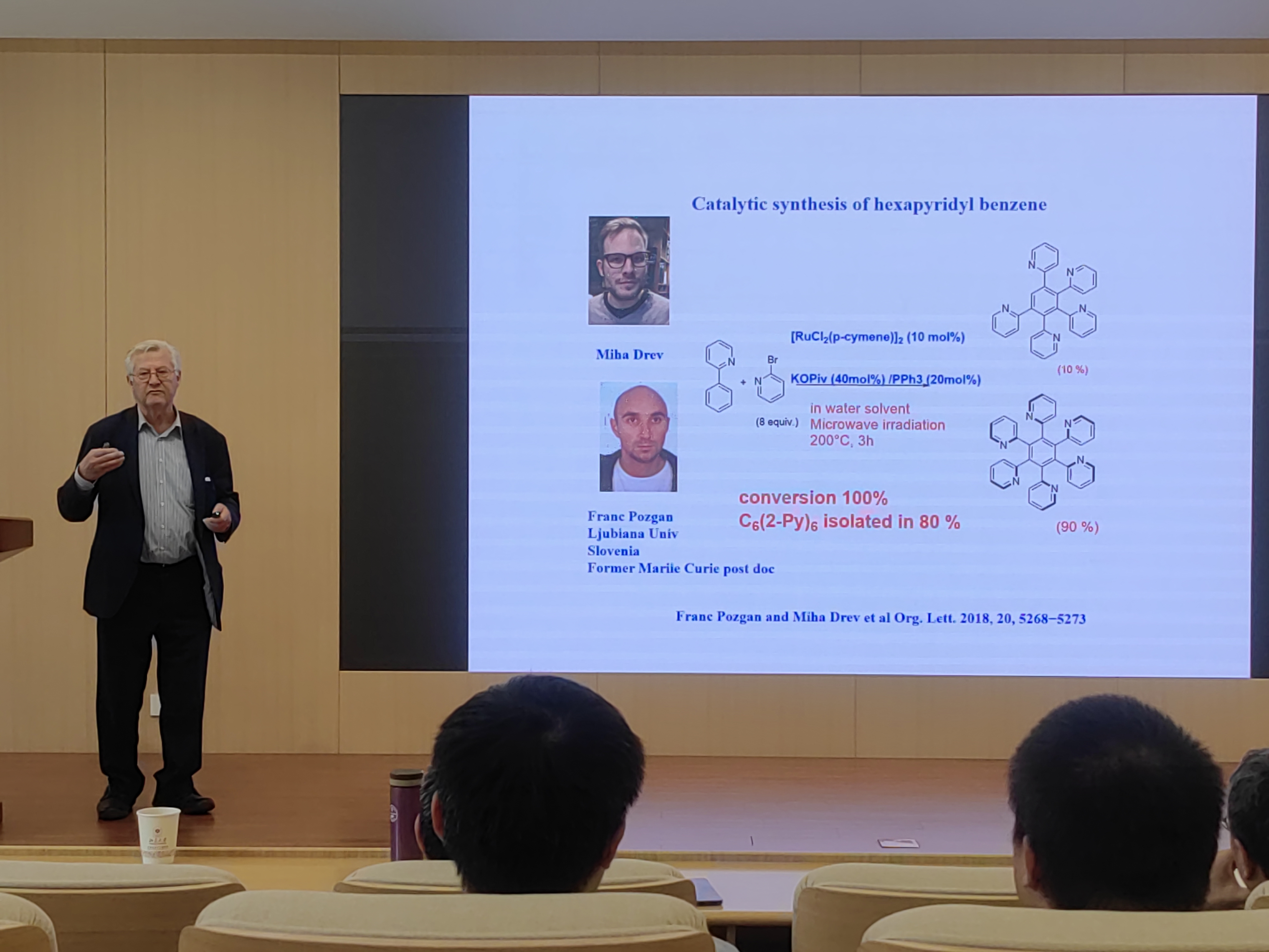 5月6日,应席老师的邀请,法国雷恩第一大学的Dierre H. Dixneuf教授和中国科学院大连化学物理研究所的吴小锋研究员来组访问,在课题组概览展板前与老师、同学们合照。下午,中国化学会秘书长范青华研究员为Dixneuf教授颁发了中国化学会荣誉会士证书,随后Dixneuf教授做了题为《Catalytic Functionalisations of Pyridines and Phosphines and Mild Hydrogenations of Nitroarenes for lnnovative Syntheses》的报告,吴小锋研究员做了题为《Abundant Metal-Catalyzed Carbonylative Transformations》的报告,并与老师、同学们展开了热烈的交流讨论。