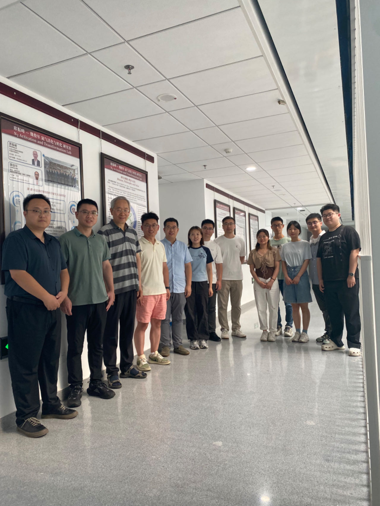 热烈欢迎谭庚文、杜景祯和郭帅三位教授来组访问! 时间:2024-07-19 来源:作者: 字体: 【小】 【中】 【大】 7月19日,中山大学谭庚文教授,郑州大学杜景祯教授,首都师范大学郭帅教授来到研究室访问,三位教授参观了实验室各种仪器设备及展板,并和大家一起合影留念。谭庚文教授目前任职于中山大学化学学院,他长期从事新型主族元素化合物的合成、表征与性质研究,近期主要集中研究单配位主族元素化合物。杜景祯教授目前任职于郑州大学化学学院,他长期从事f区金属有机配位化学等相关领域的研究工作。郭帅教授目前任职于首都师范大学化学系,他长期从事氮杂环卡宾的金属有机化学研究。感谢三位教授的来访!