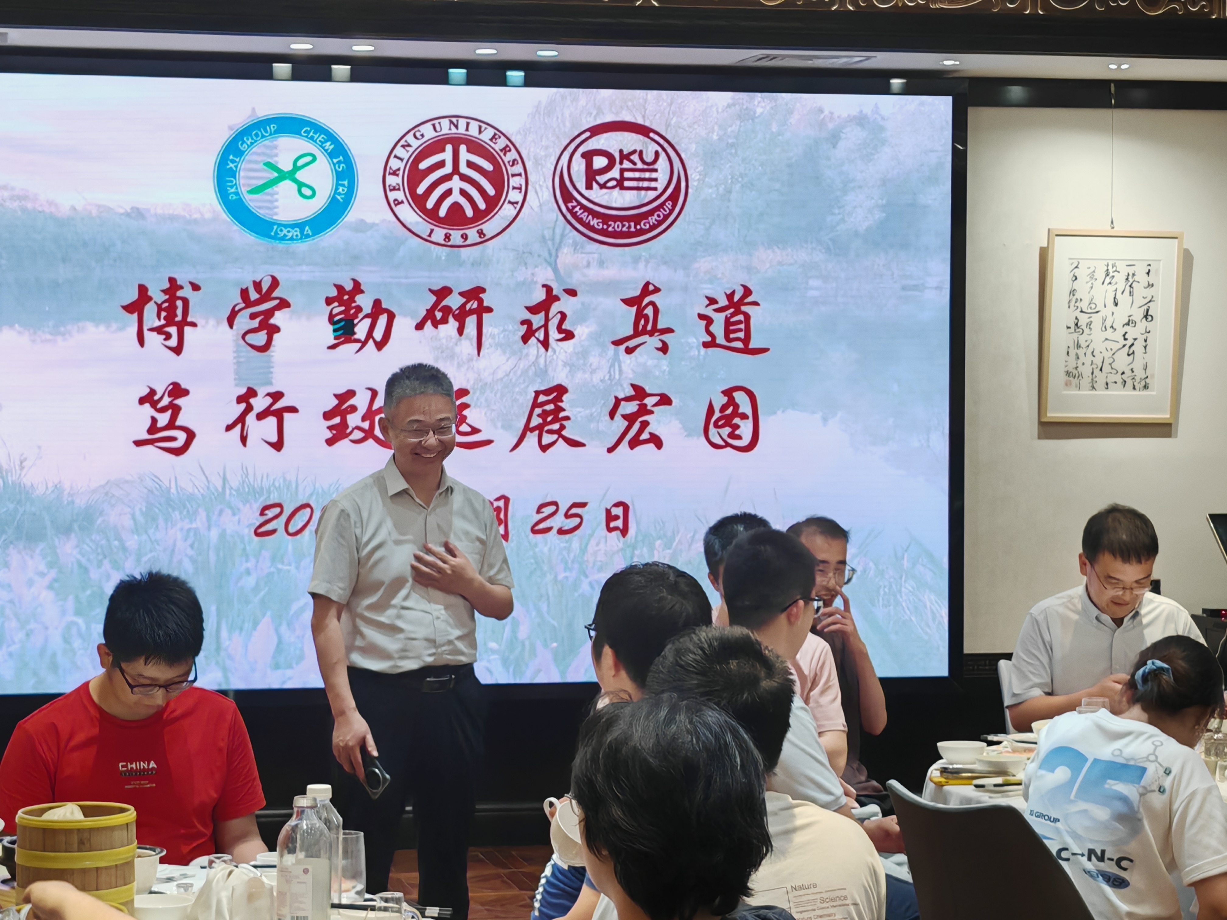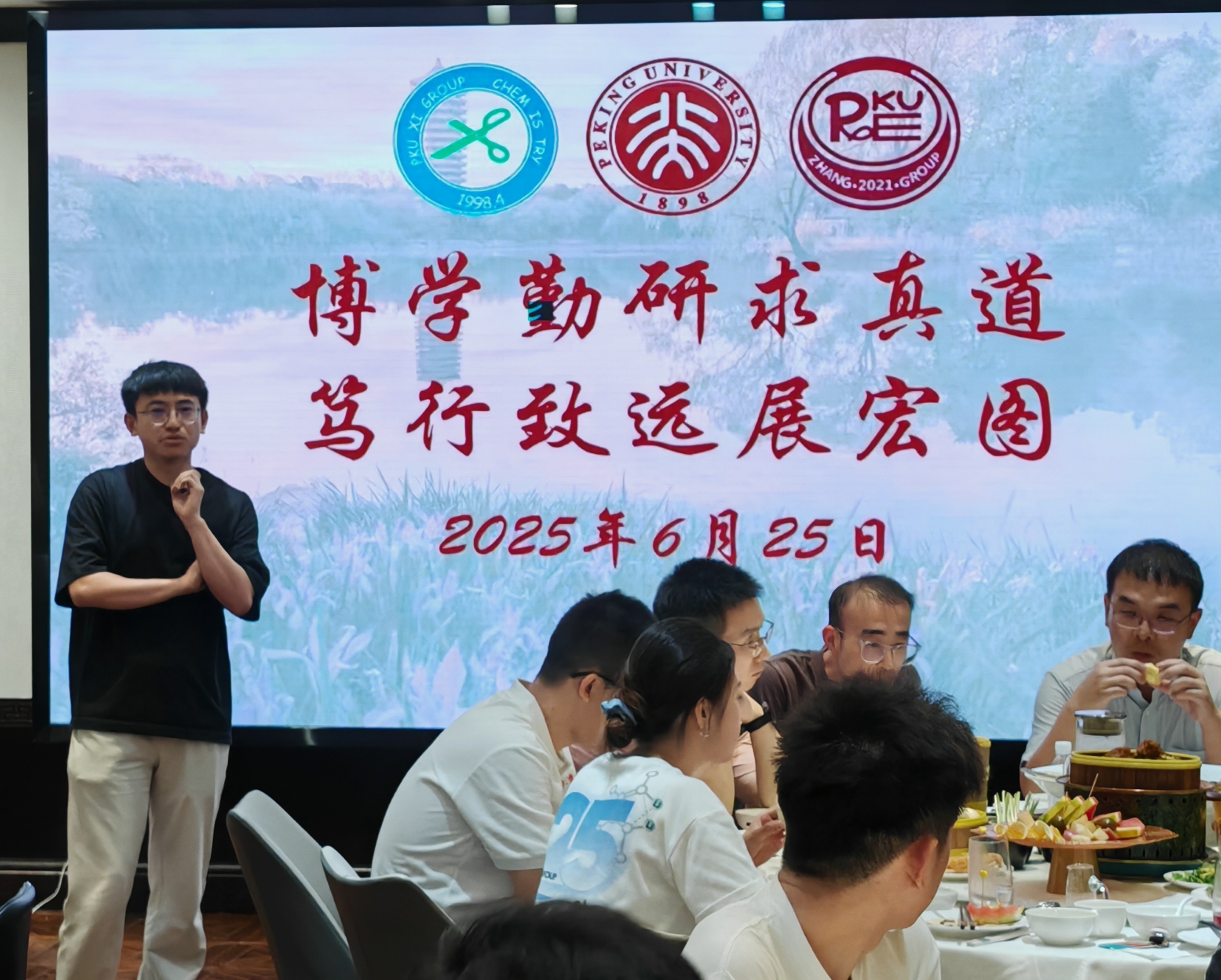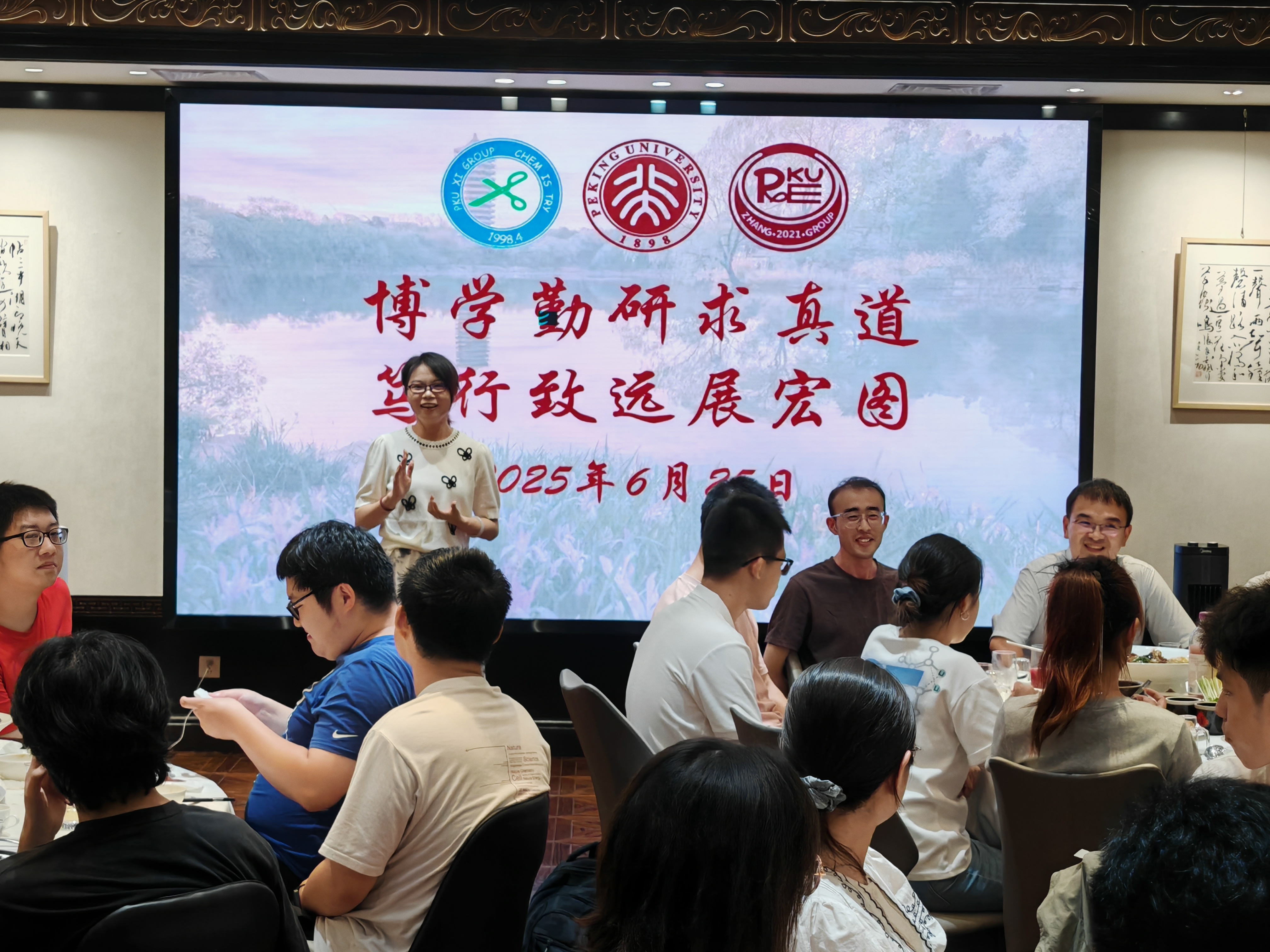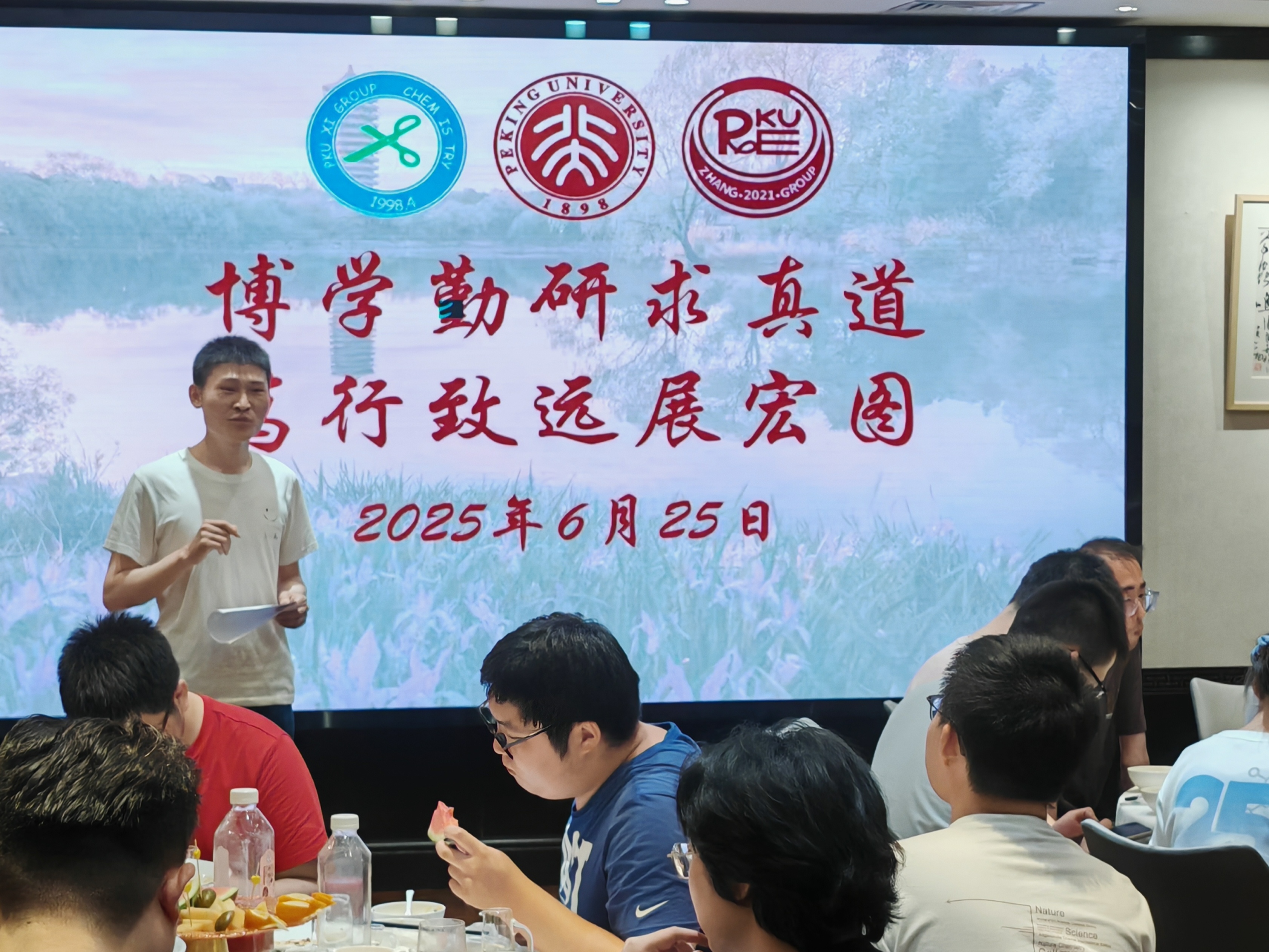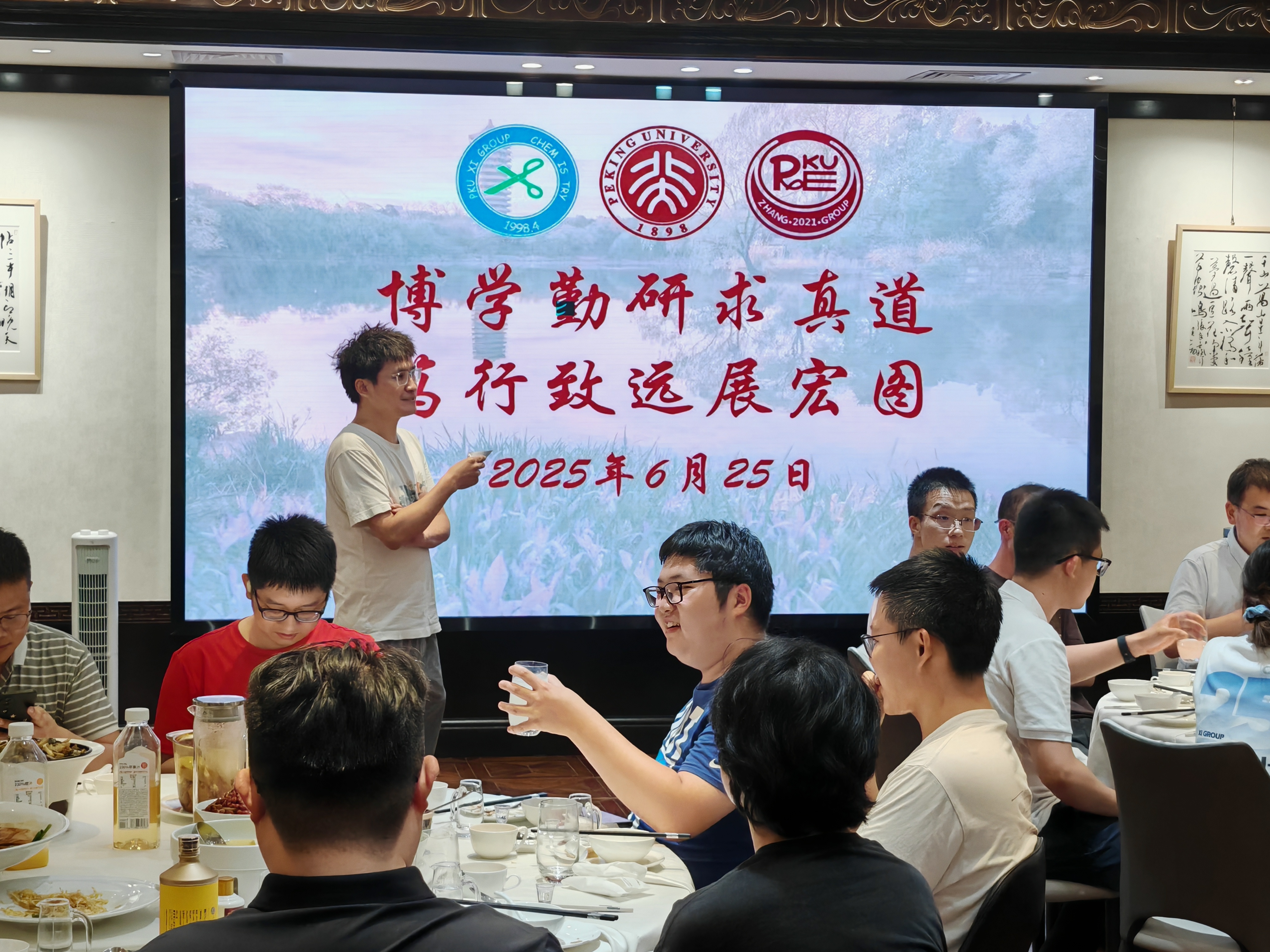2025年6月26日下午,两个研究室全体成员在A区大楼一起和毕业生拍照留念。当晚大家举行毕业生欢送会,席老师、张老师分别致辞,感谢全体毕业生为两个研究室所做出的贡献,期待他们在未来的研究与工作中取得新的突破!所有毕业生,以及准备离站的博士后师兄们先后回顾了在组期间的科研与生活,感谢三位老师对他们的培养以及实验室所有同学的帮助,祝愿研究室取得更多更出色的研究成果,并祝愿师弟师妹们科研顺利!
