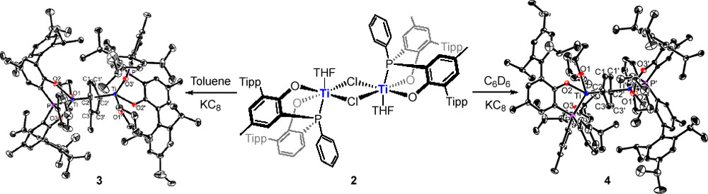 A bulky tridentate bis(3-methyl-5-aryl-hydroxyphenyl)phenylphosphine (aryl = 2,4,6-tri-isopropylbenzene, Tipp[O, P, O]) ligand 1 was synthesized. Reaction of 1 with TiCl3(THF)3 (THF = tetrahydrofuran) afforded bis{Tipp[O, P, O] titanium (THF)0.59(Et2O)0.41(μ-chloro)} (2). By reducing 2 with KC8 in toluene or C6D6, two arene-bridged dititanium complexes{Tipp[O, P, O]}2 titanium (μ-η6:η6-C6H5Me) (3) and {Tipp[O, P, O]}2 titanium (THF)0.58(Et2O)0.42(μ-η6:η6-C6D6) (4) were obtained, respectively, and structurally characterized. Complexes 3 and 4 featured an inverted sandwich-type structure consisting of a distorted η6-toluene or η6-benzene unit. Density functional theory calculations analyzed the reason for the loss of aromaticity in the distorted aromatic rings.