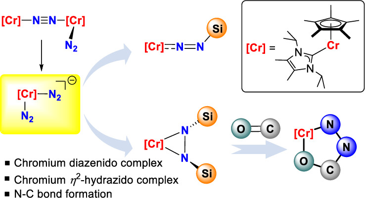 Isolation of key intermediate complexes in dinitrogen functionalization is crucial for elucidating the mechanistic details and further investigation. Herein, the synthesis and characterization of (μ-η1:η1-N2)(η1-N2)-Cr(I) 3 and (η1-N2)2-Cr(0) complexes 4 supported by Cp* (Cp* = C5Me5) and NHC ligands were reported. Further functionalization of Cr(0)-N2 complex 4 with silyl halides delivered the key intermediates in the alternating pathway, the chromium diazenido complex 5 and the chromium side-on η2-hydrazido complex 6. Protonation of 6 led to the quantitative formation of N2H4. Moreover, the [η2-Me3SiNNSiMe3]2– unit in 6 enabled N–C bond formation reactions with CO2 and tBuNCO, giving the corresponding N,O-chelating hydrazidochromium complexes 7 and 8, respectively.