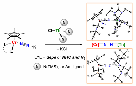 Thorium–dinitrogen complexes, long proposed as critical intermediates for actinide-mediated dinitrogen activation and bond cleavage, have not been isolated. In this work, three heterobimetallic [Cr]–N2–[Th] complexes featuring a Th–N2 moiety were synthesized via a metathesis reaction between a chromium(0) dinitrogen precursor and Th(IV) chloride derivatives. X-ray crystallographic analysis unambiguously confirmed their heterobimetallic [Cr]–N2–[Th] bridging geometry. Density functional theory (DFT) calculations revealed non-negligible 5f orbital contributions to the Th–N bonding interactions.